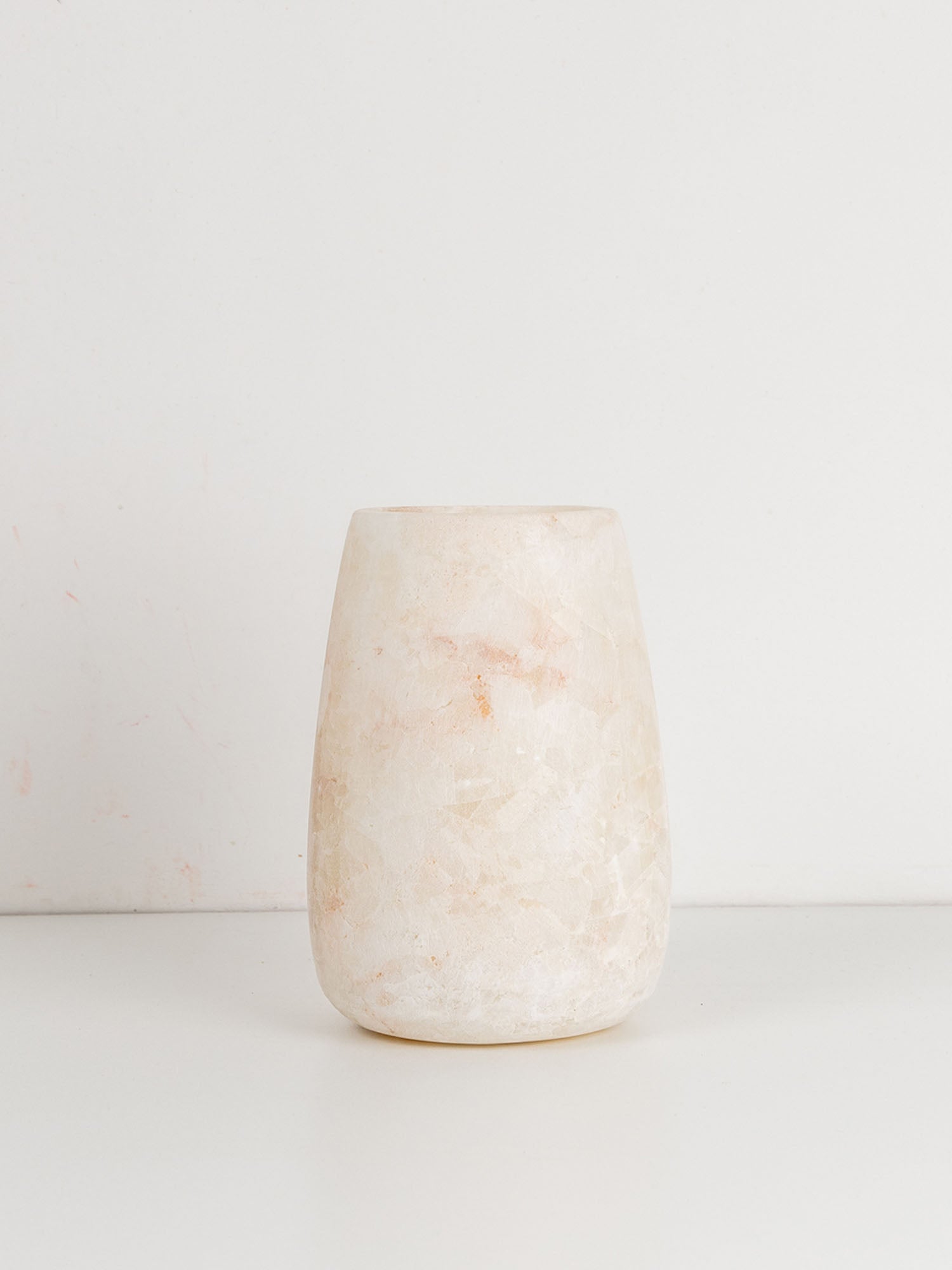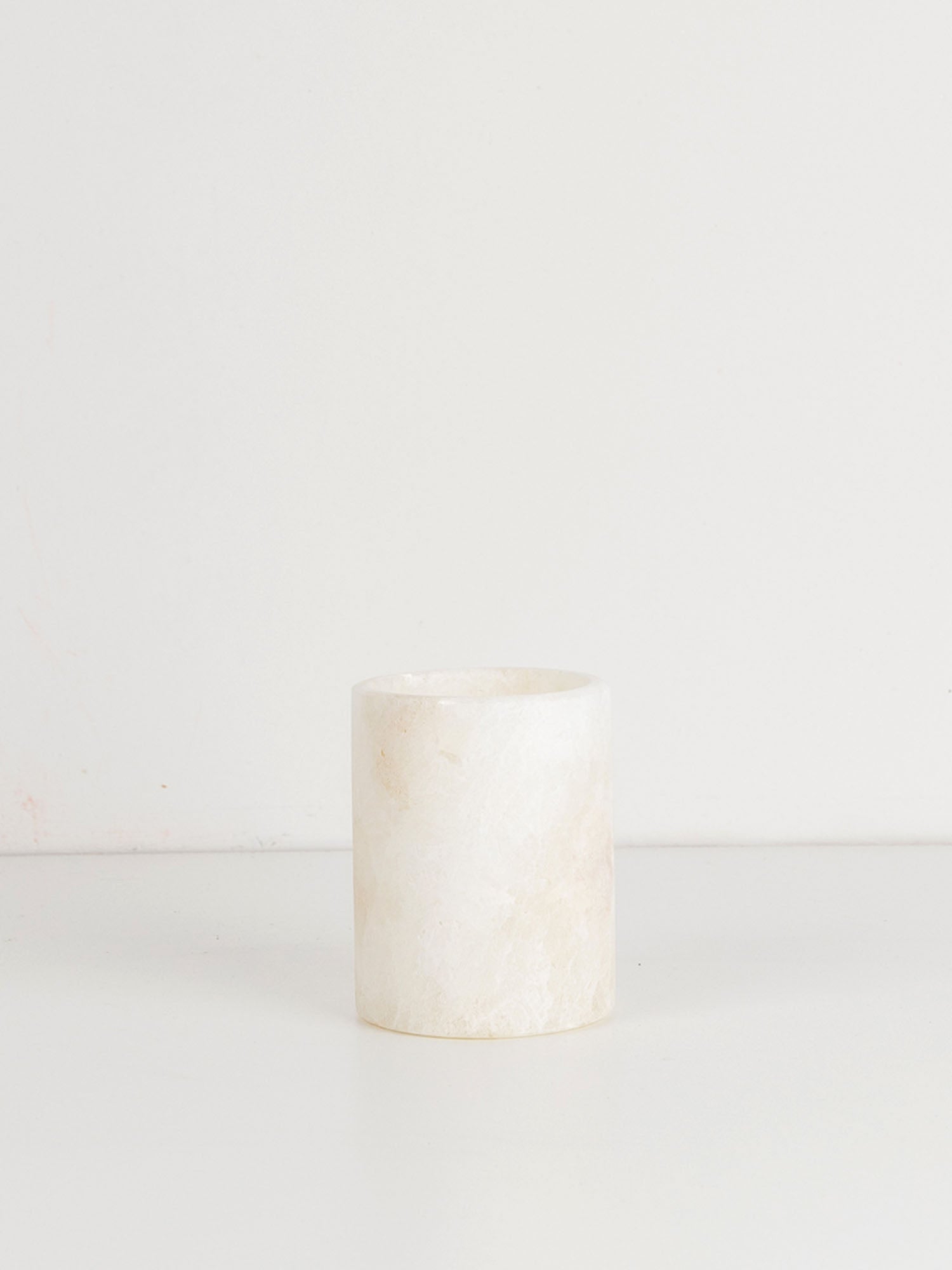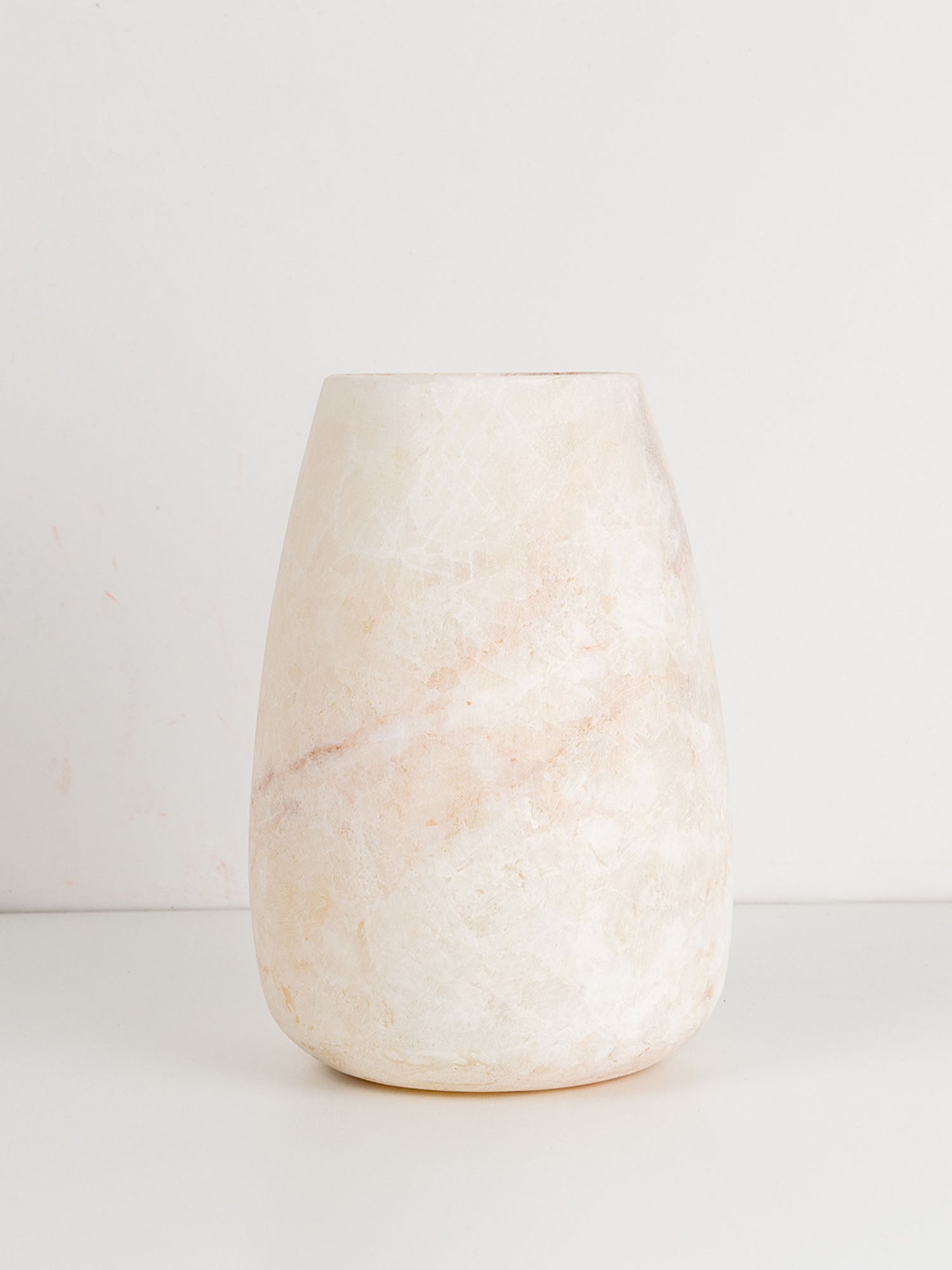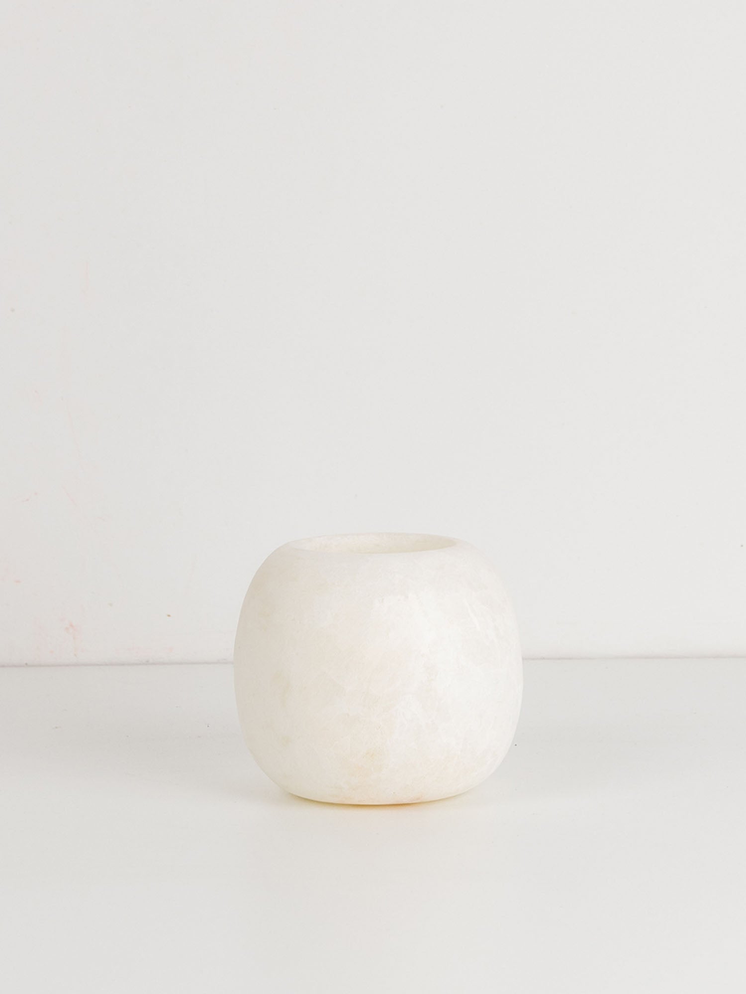 These handcrafted candle holders are intricately handcrafted from Egyptian alabaster. Each candle holder is made from a single piece of stone. Alabaster should not be cleaned with water. We recommend covering the bottom with some sand to protect the vessel from wax stains.
