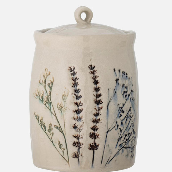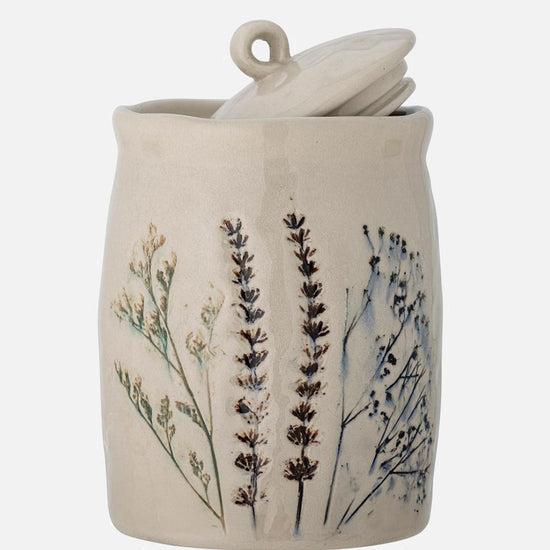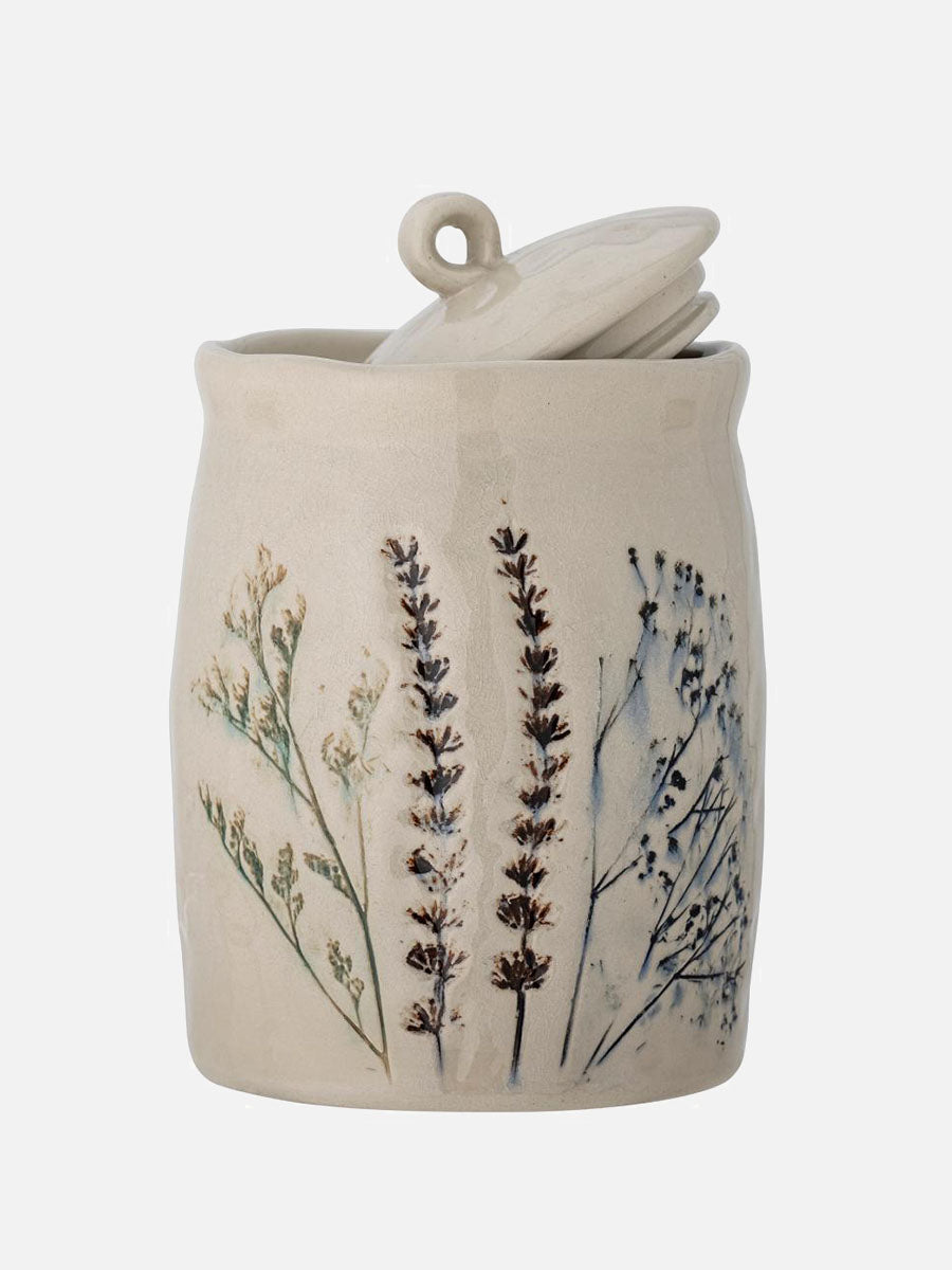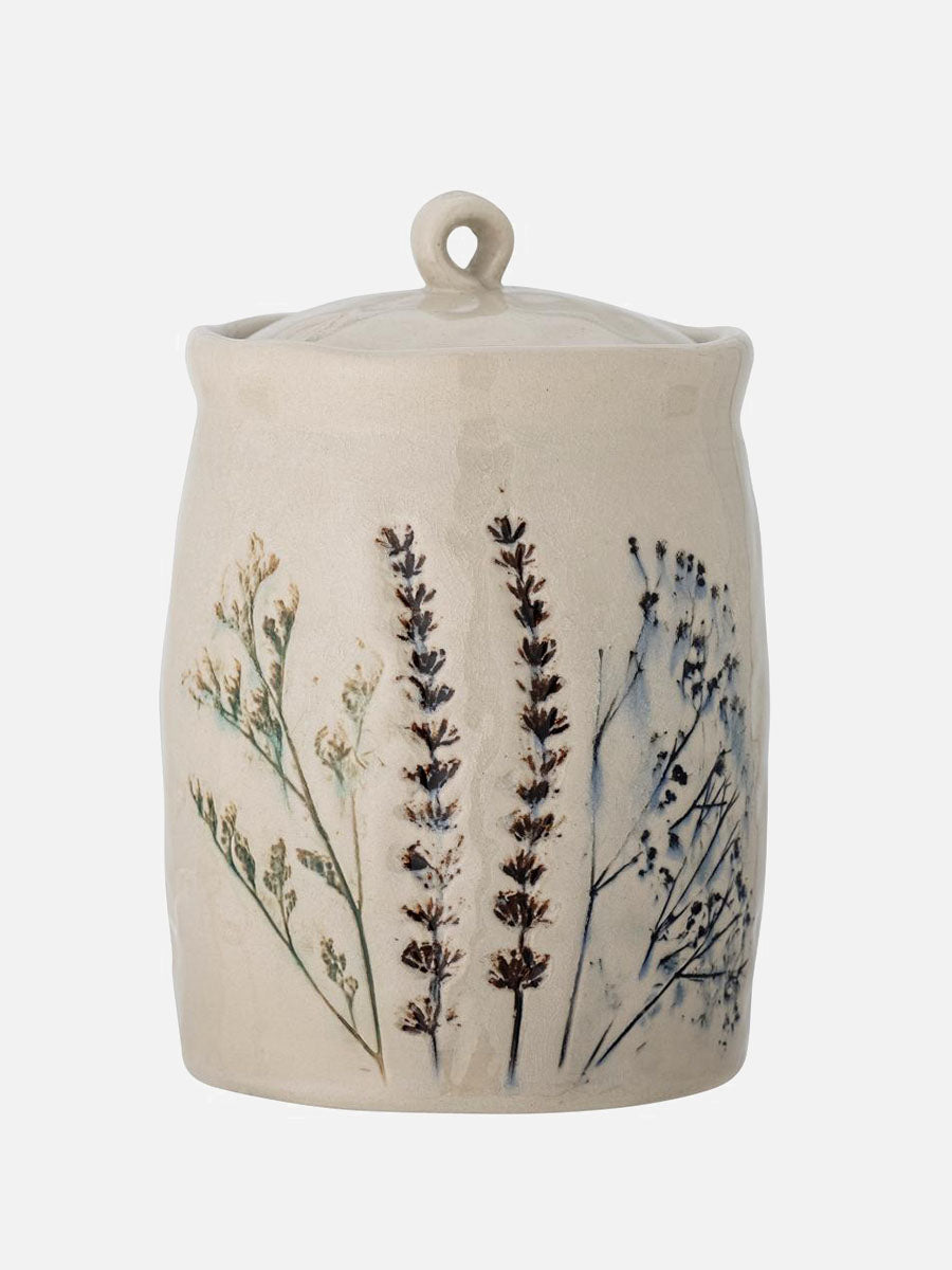 The Floris storage jar made of stoneware combines timeless shapes with delicate, hand-painted details. A subtle floral motif lies over the softly crackled glaze, giving the jar a calm and warm appearance.