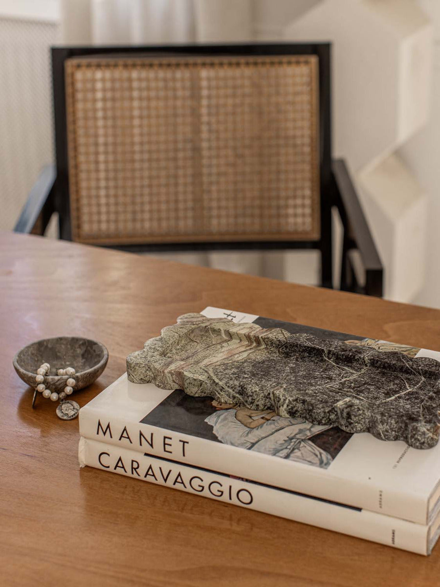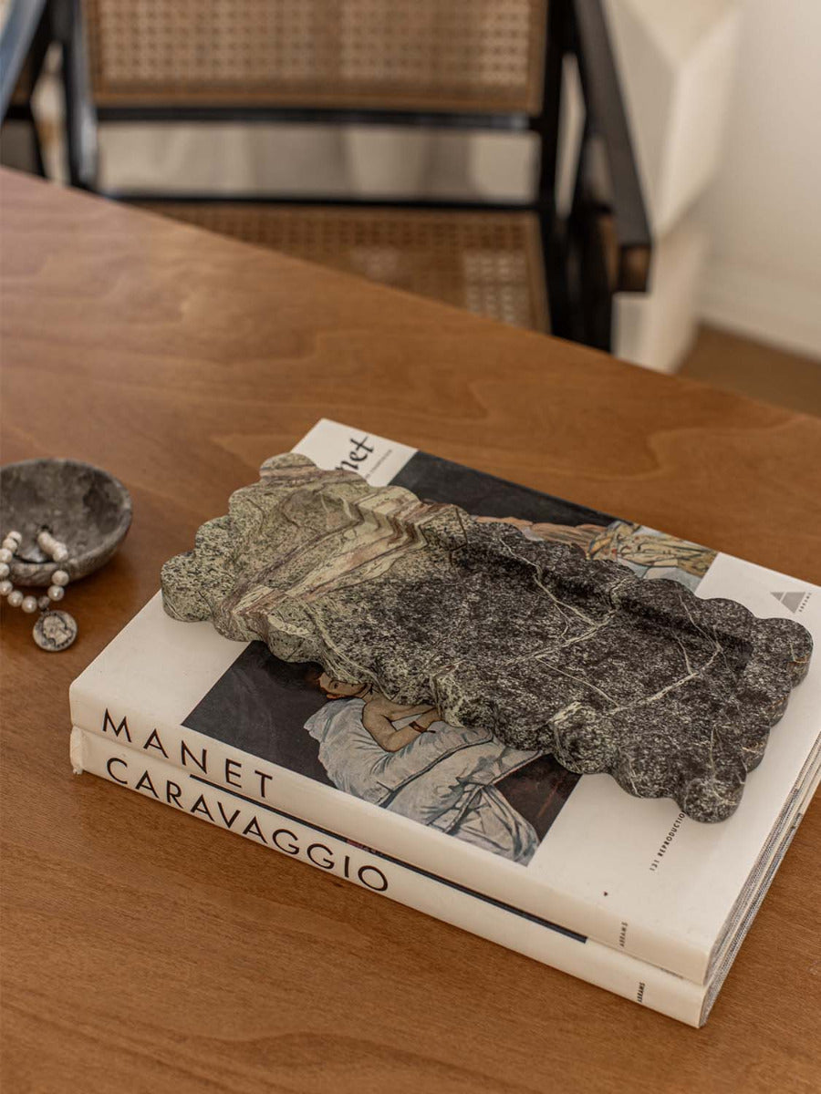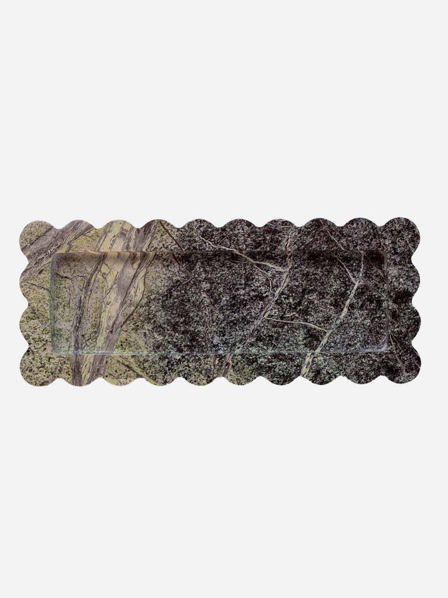 The sculptural marble tray in the color Deep Forest, artfully handcrafted in India, is a tribute to natural beauty and craftsmanship. The natural coloration of marble varies from piece to piece, making each one an exclusive unique item.