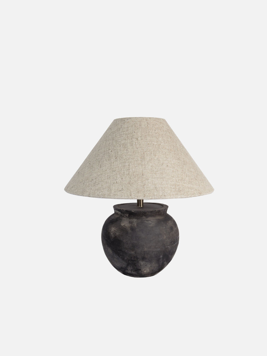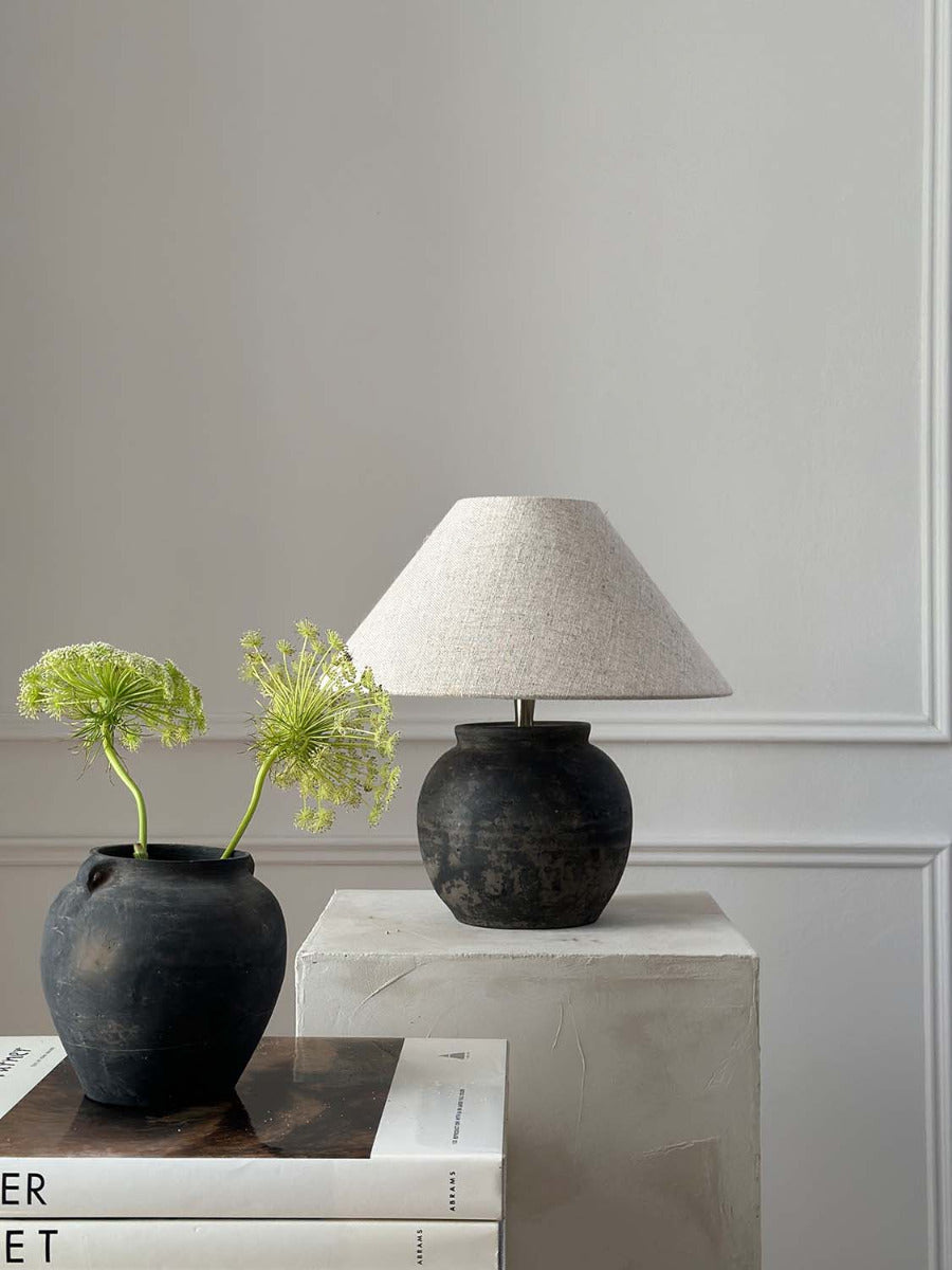 Pequeña lámpara de mesa única con un refinado aspecto wabi-sabi. La base de la lámpara está hecha de una antigua maceta de arcilla gris y tiene una hermosa pátina debido a su antigüedad. La pantalla está hecha de lino belga. Tenga en cuenta que cada base de lámpara es única y variará en textura y color.