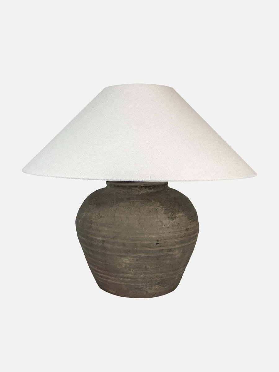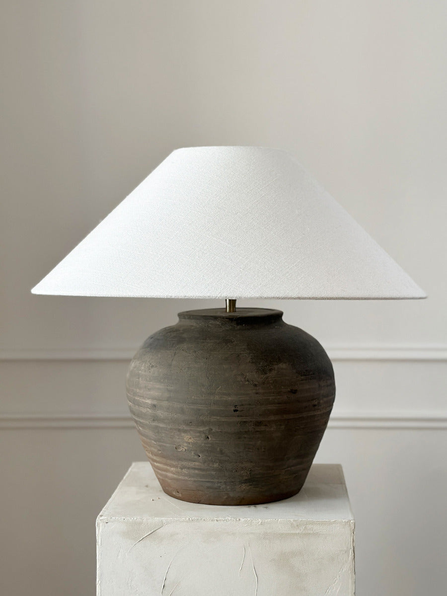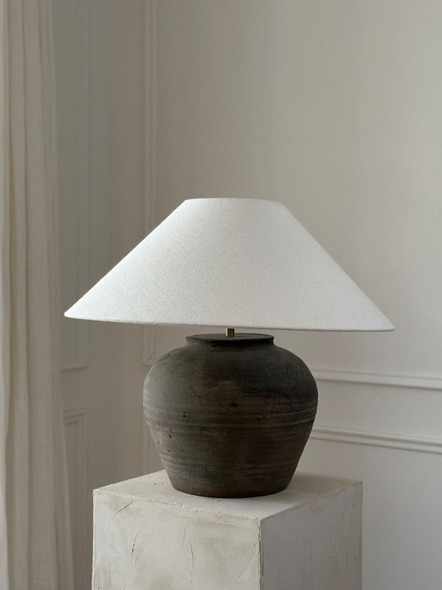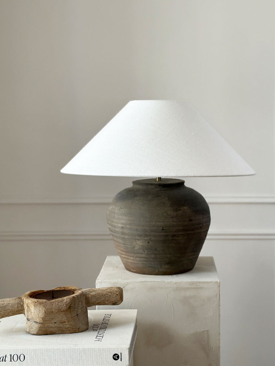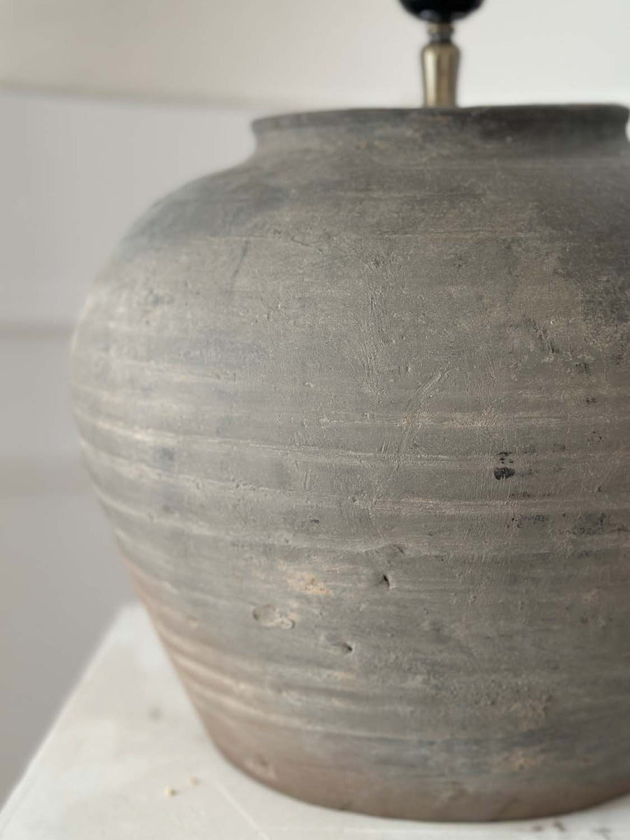 Petite lampe de table unique avec un look wabi-sabi raffiné. Le socle de la lampe est fabriqué à partir d'un pot en argile grise antique et présente une belle patine due à son âge. L'abat-jour est en lin belge. Veuillez noter que chaque socle de lampe est unique et variera en texture et en couleur.