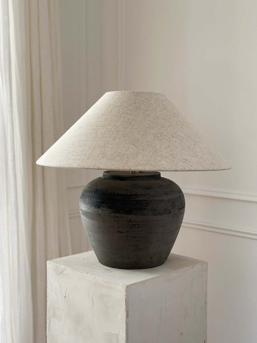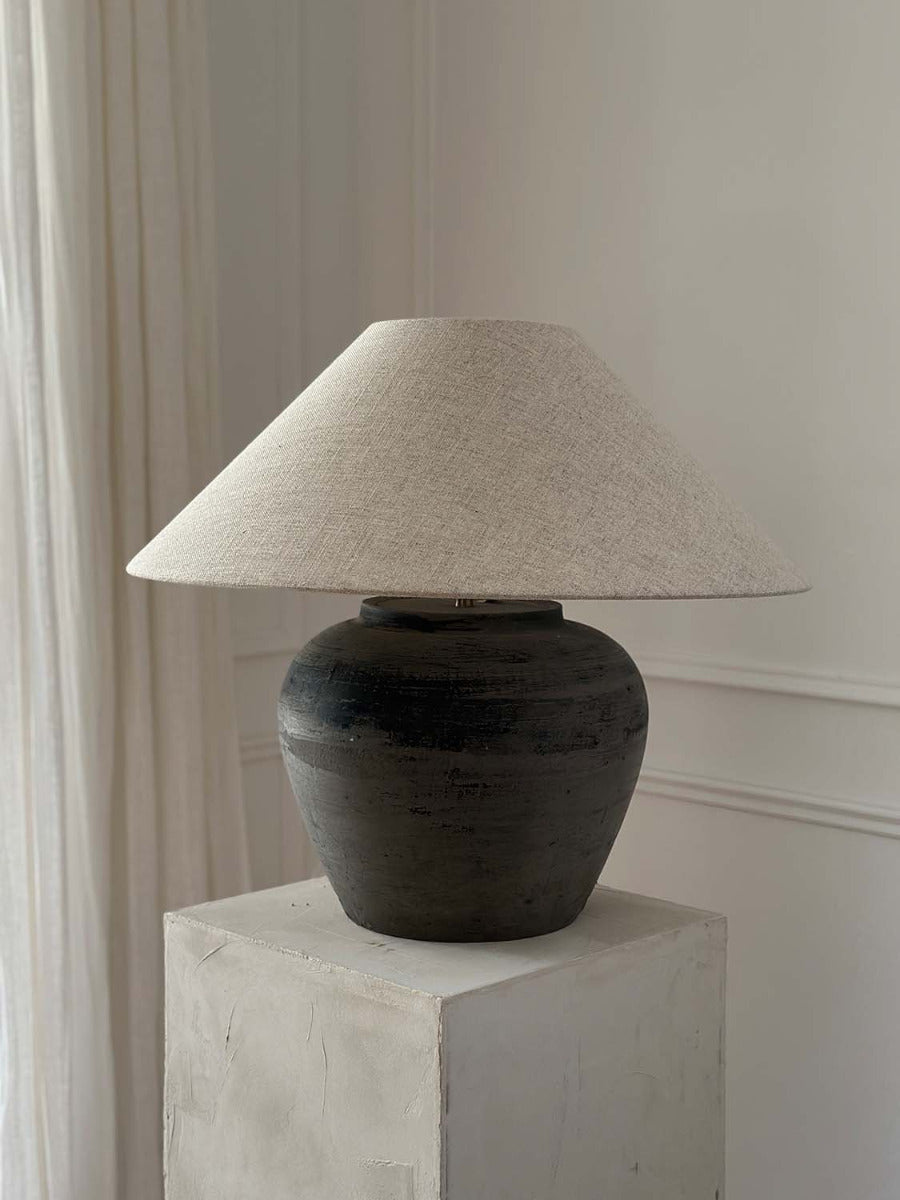 Petite lampe de table unique avec un look wabi-sabi raffiné. Le socle de la lampe est fabriqué à partir d'un pot en argile grise antique et présente une belle patine due à son âge. L'abat-jour est en lin belge. Veuillez noter que chaque socle de lampe est unique et variera en texture et en couleur.