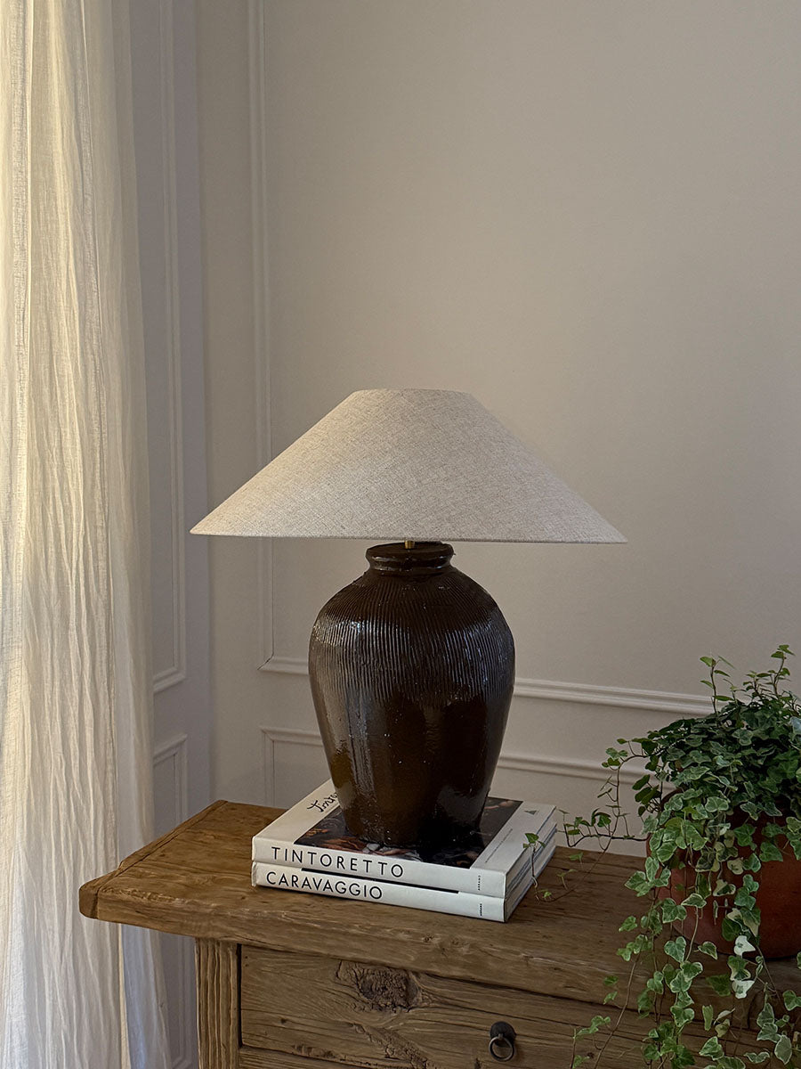 Lampe de table unique faite à la main : le pied de la lampe a été fabriqué à partir d'un récipient en terre cuite d'environ 120 ans et présente une belle patine due à son âge. L'abat-jour est en lin belge.
