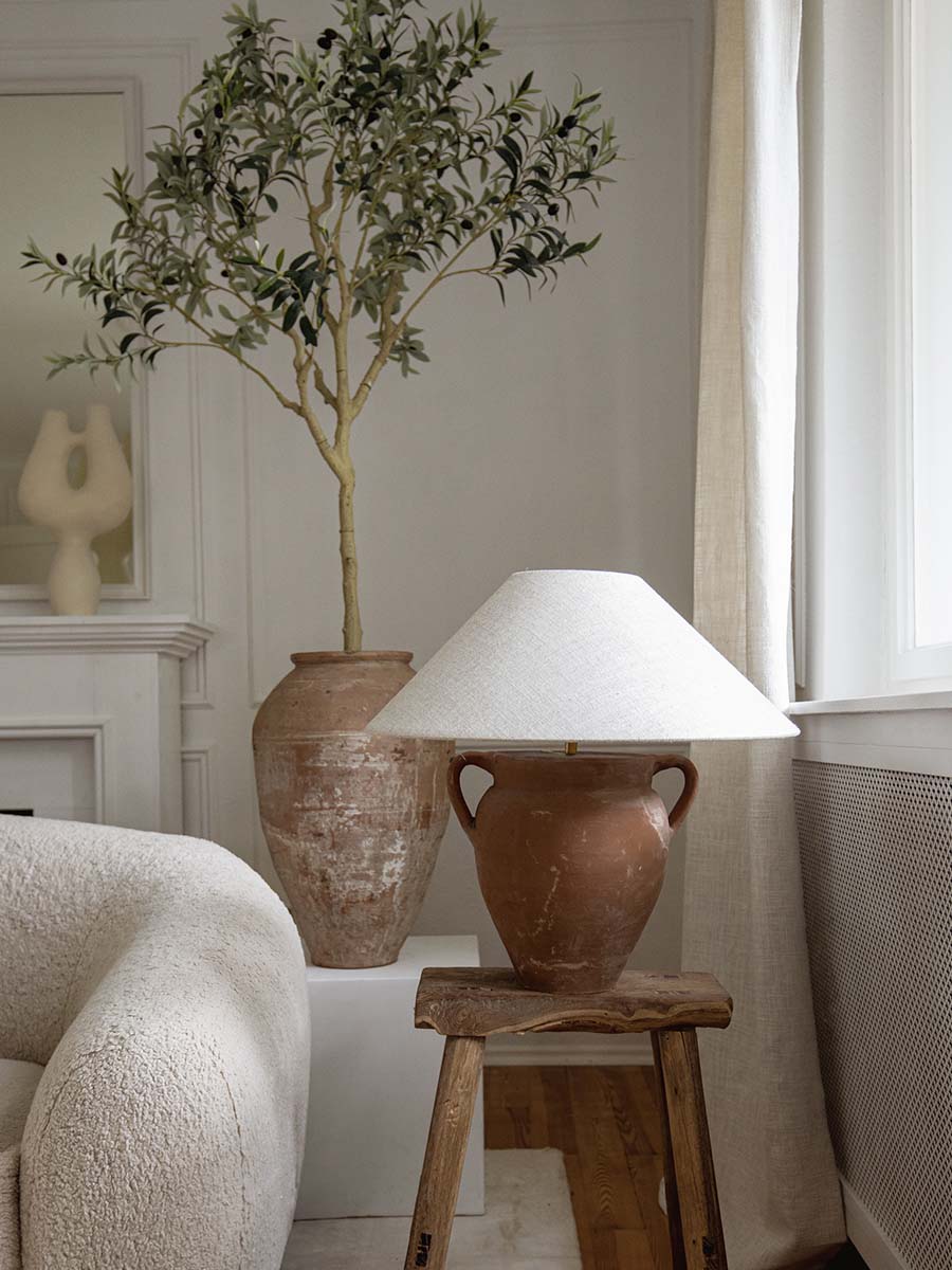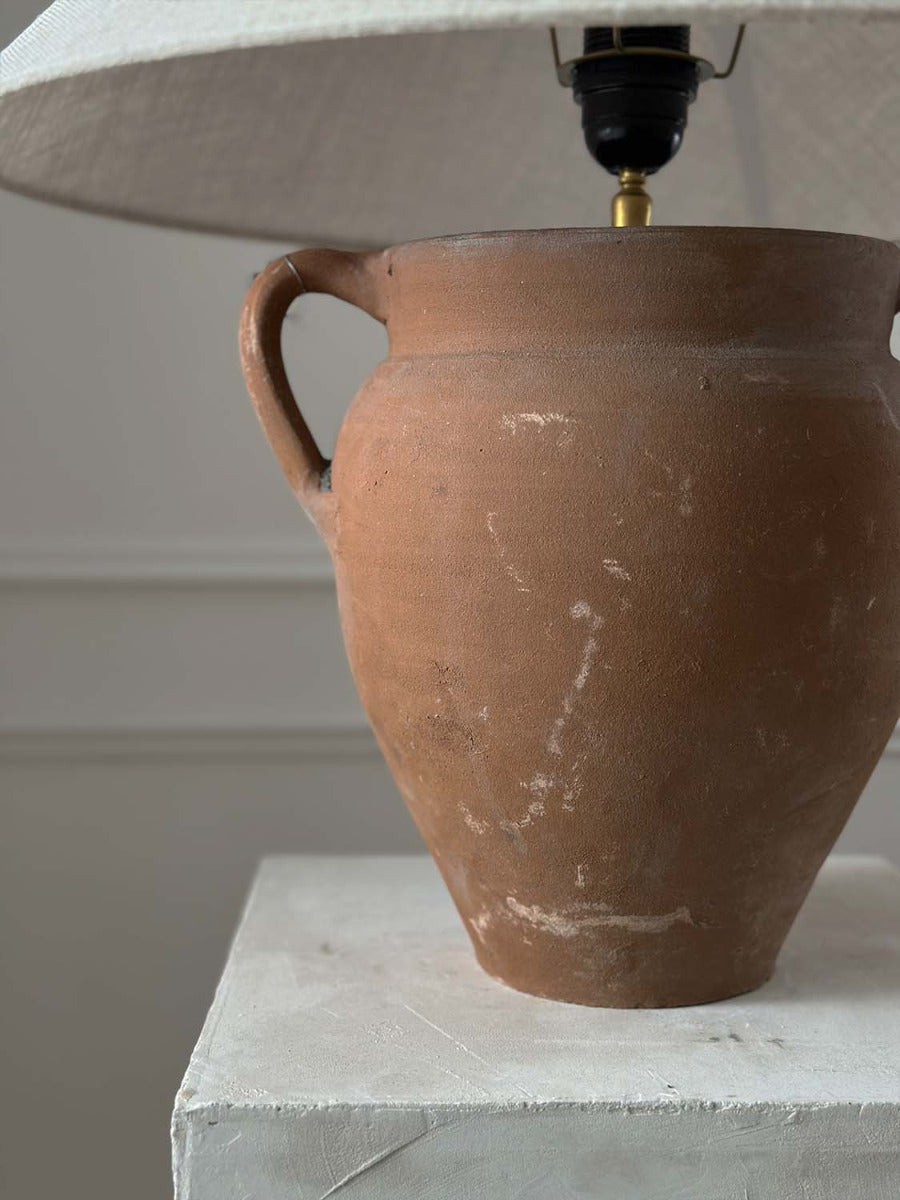 Lampe de table unique faite à la main : le pied de la lampe a été fabriqué à partir d'un vase en terre cuite vieux de 120 ans et présente une belle patine due à son âge. L'abat-jour est en lin belge.