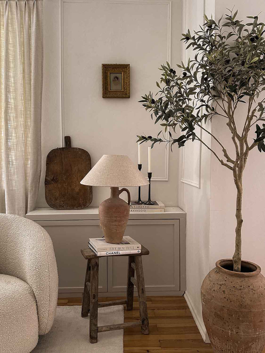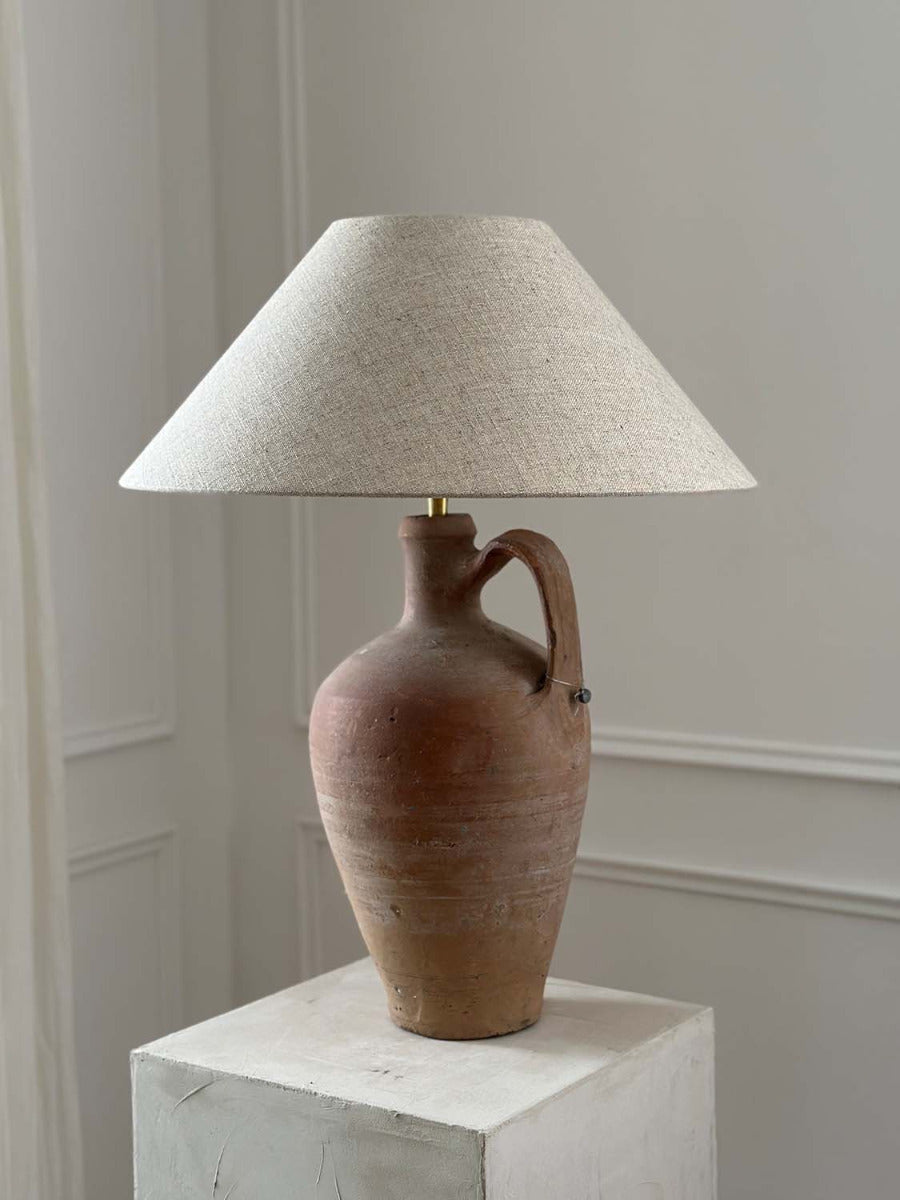 Lampe de table unique faite à la main : le pied de la lampe a été fabriqué à partir d'un vase en terre cuite vieux de 120 ans et présente une belle patine due à son âge. L'abat-jour est en lin belge.