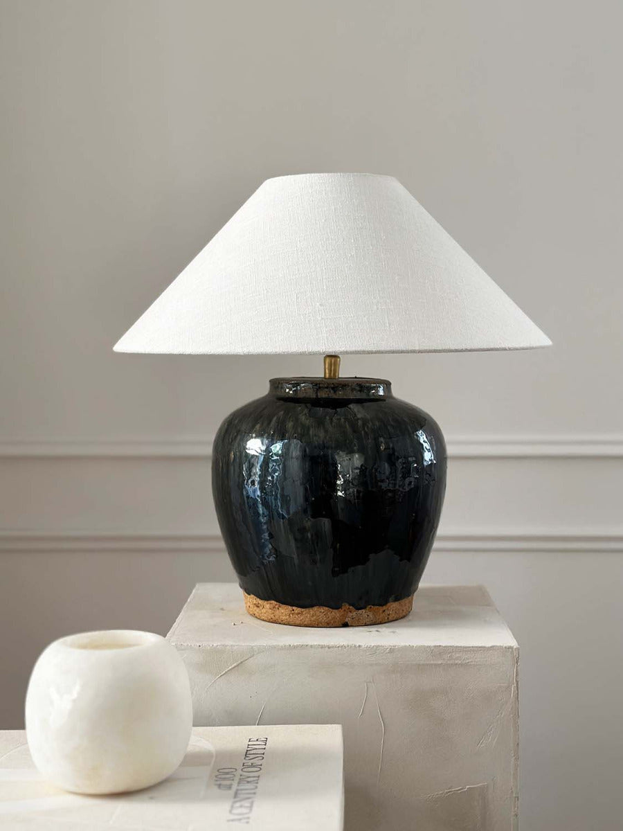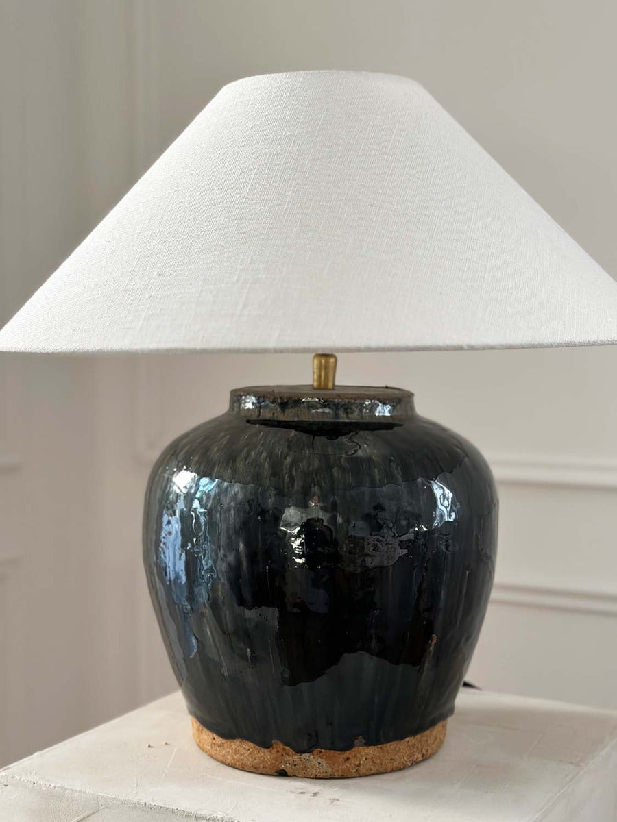 Lampe de table unique faite à la main dans un style wabi-sabi raffiné. Le pied de lampe est fabriqué à partir d'un ancien pot en argile émaillée foncée et présente une belle patine due à son âge. L'abat-jour est en lin belge. Veuillez noter que chaque pied de lampe est unique et qu'il y aura des variations de texture et de couleur.