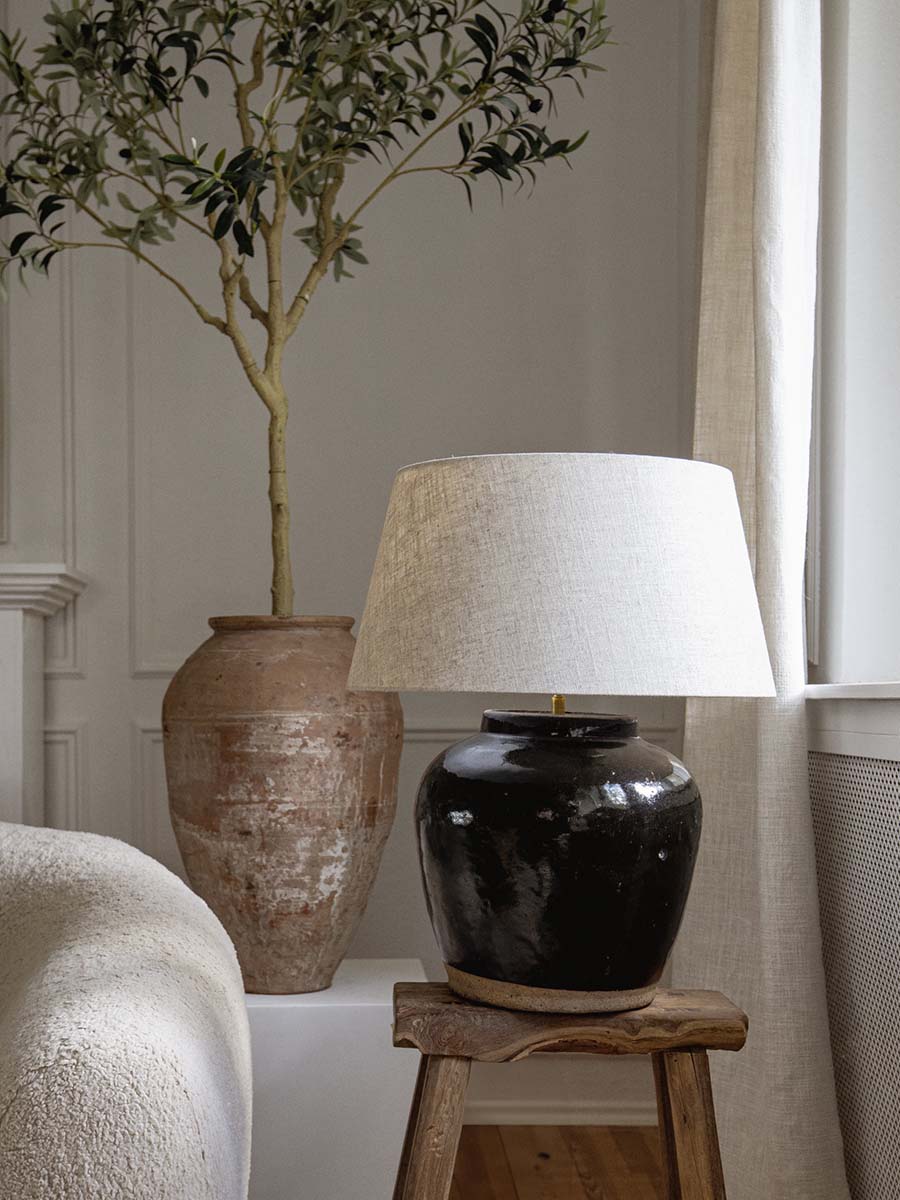 Lampe de table unique faite à la main dans un style puriste Wabi Sabi. Le pied de la lampe est fabriqué à partir d'un récipient en terre cuite antique noir laqué et présente une belle patine due à l'âge. L'abat-jour est de couleur naturelle et est en lin belge. Chaque lampe est une pièce unique. 2 pièces disponibles.