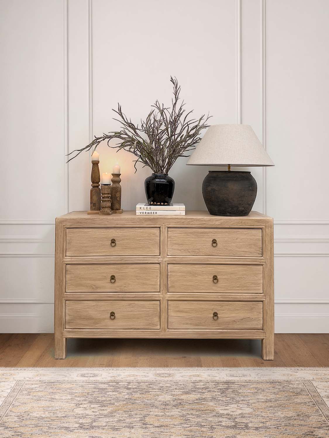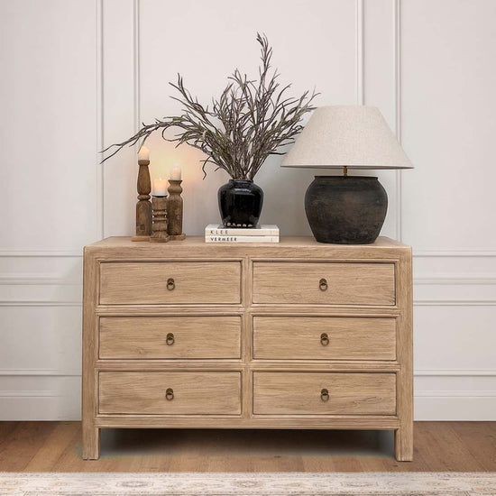 Six tiroirs offrent un espace de rangement pratique pour la vaisselle, les textiles ou les objets du quotidien. Les poignées discrètes en métal soulignent le design classique et sobre.
