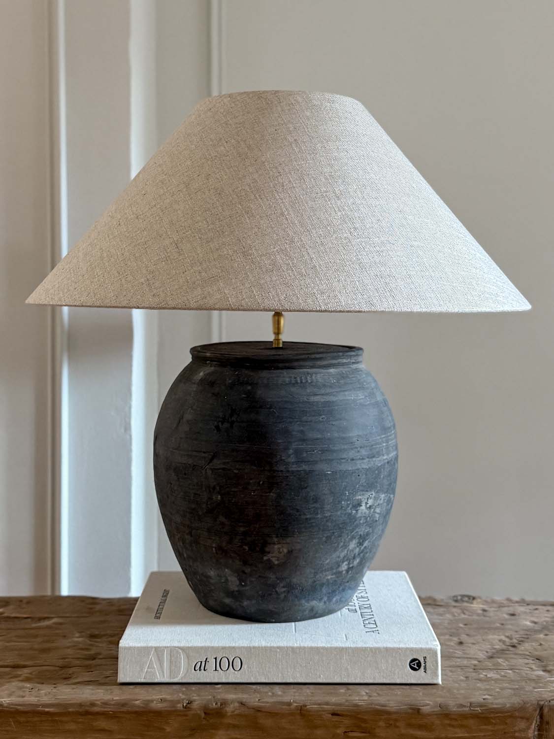 Lampada da tavolo unica fatta a mano: il piede della lampada è stato realizzato da un vaso di terracotta di circa 120 anni e presenta una bella patina dovuta alla sua età. L'ombra della lampada è realizzata in lino belga.
