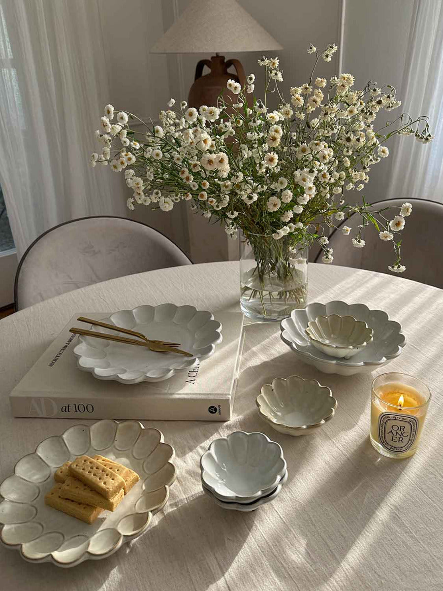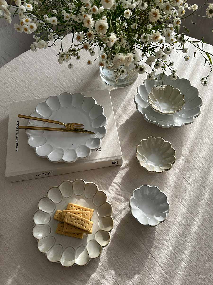 La collezione Rinka combina originalità ed eleganza con i suoi design in ceramica fatti a mano. Realizzati in Giappone utilizzando antiche tecniche artigianali, i piatti a forma di fiore aggiungono un tocco romantico alla tua mise en place.