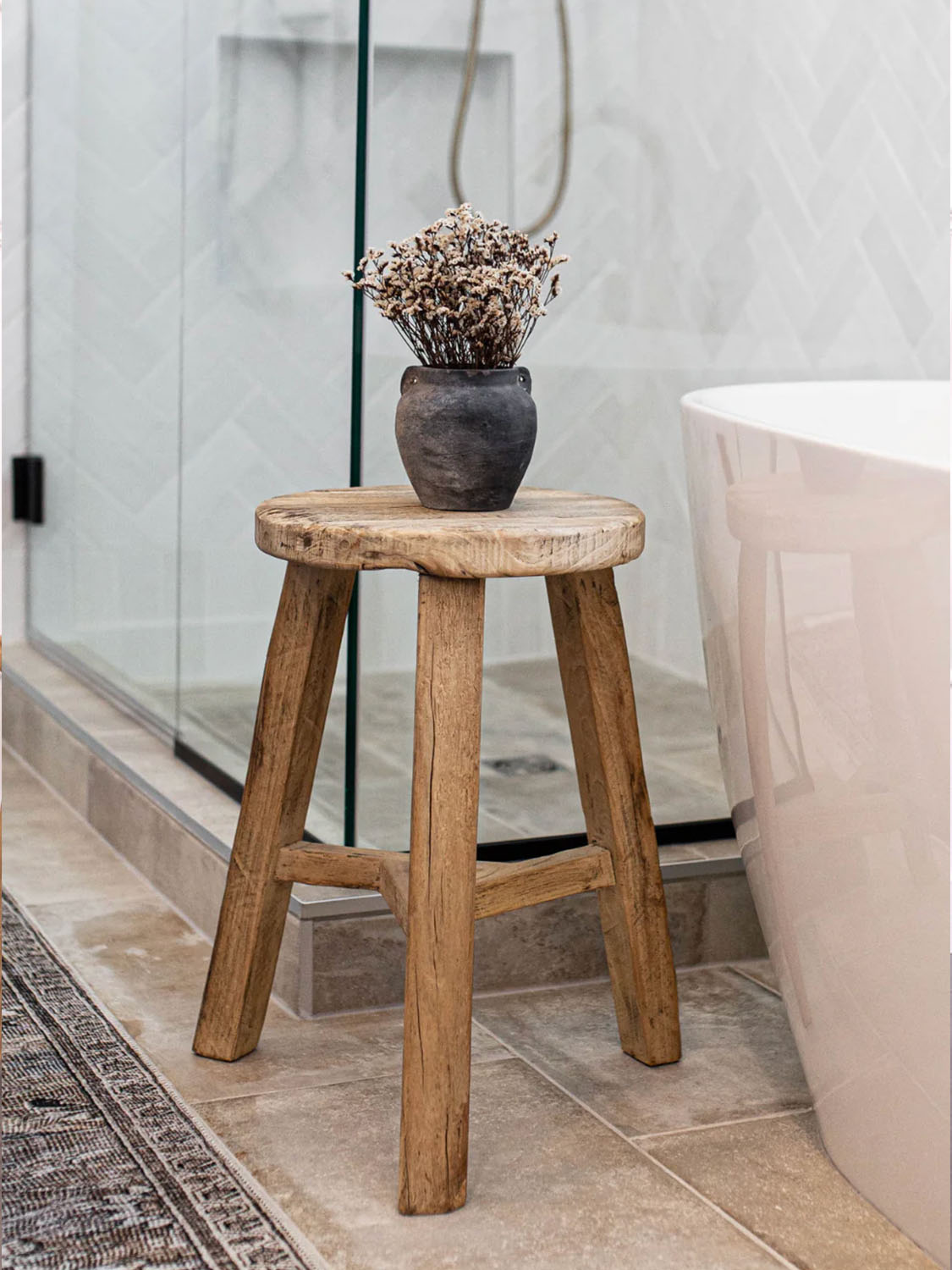 Sgabello rotondo e rustico. Questo sgabello decorativo è un pezzo unico fatto a mano ed è stato realizzato in legno di olmo.
