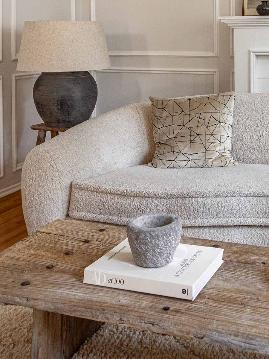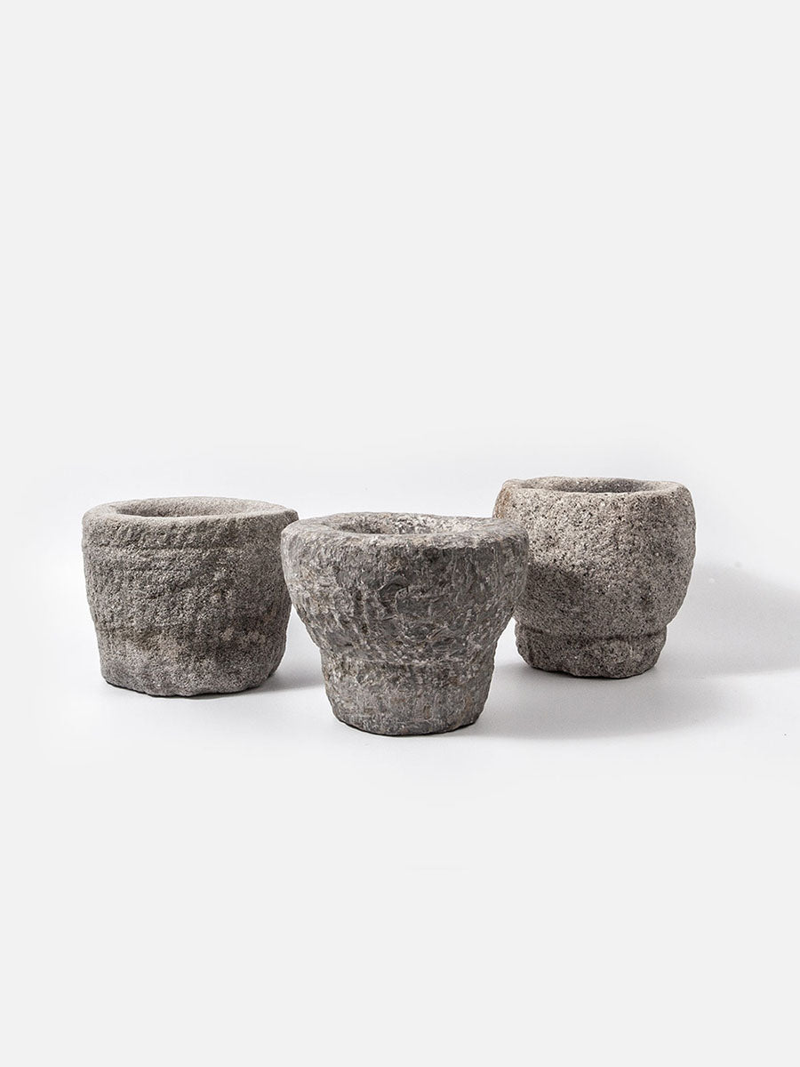 Mortaio pesante e purista in pietra dallo stile Wabi-Sabi.