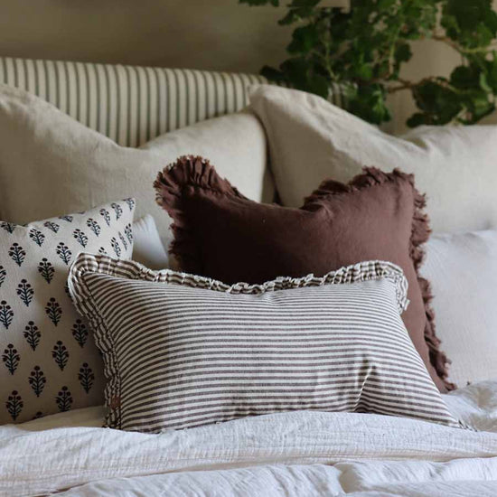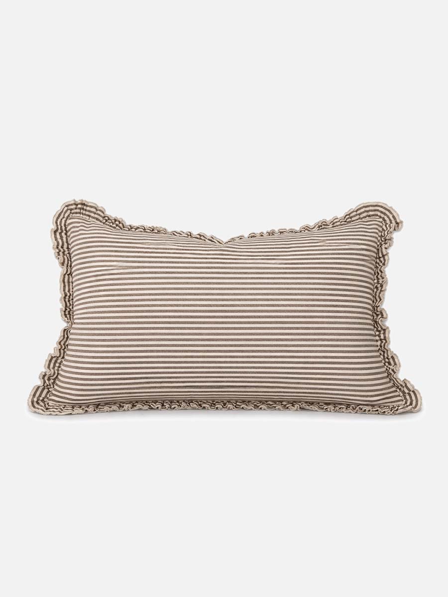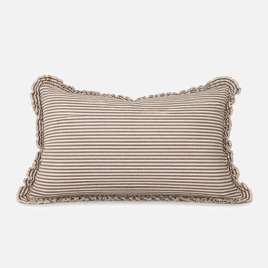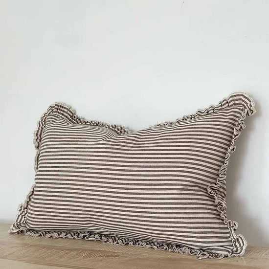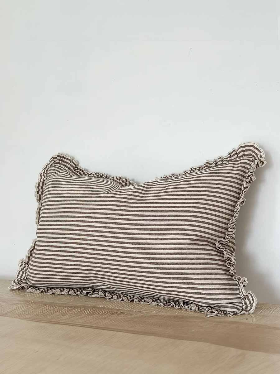 Das Kissen Celine in Dunkelbraun mit feinem Streifenmuster verbindet klassische Zurückhaltung mit zeitloser Eleganz. Die klaren Linien werden durch den dezent gerüschten Rand weich ergänzt und verleihen dem Kissen eine subtile, textile Tiefe.