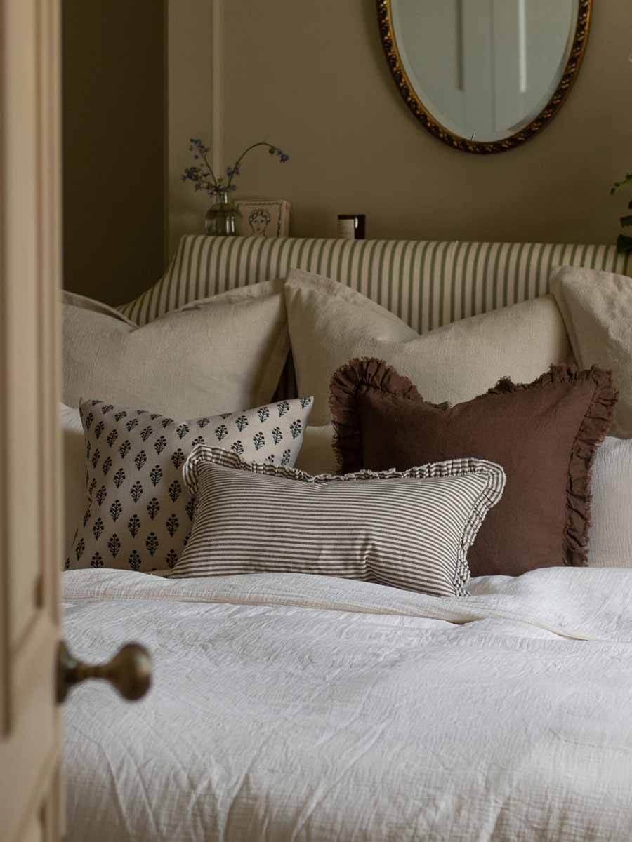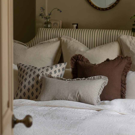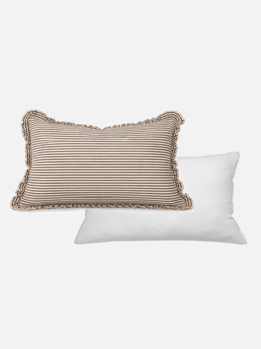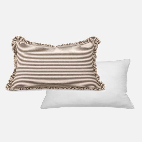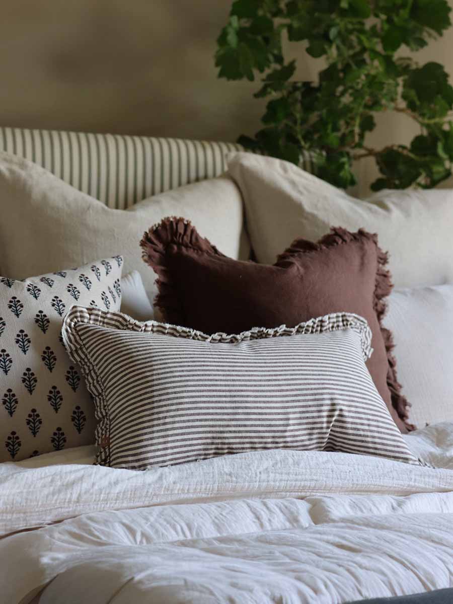 Das Kissen Celine in Dunkelbraun mit feinem Streifenmuster verbindet klassische Zurückhaltung mit zeitloser Eleganz. Die klaren Linien werden durch den dezent gerüschten Rand weich ergänzt und verleihen dem Kissen eine subtile, textile Tiefe.