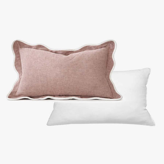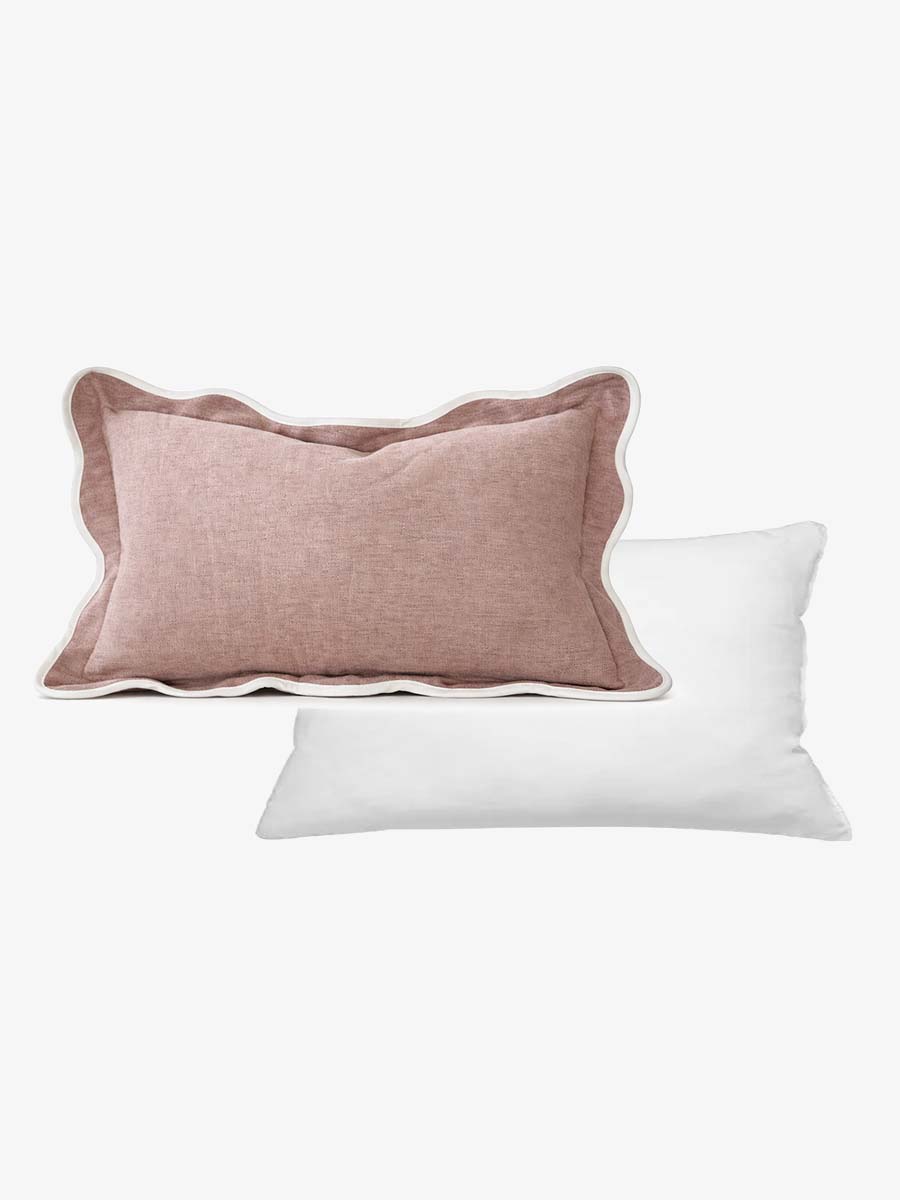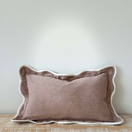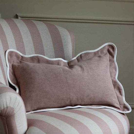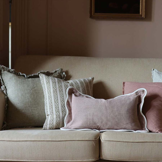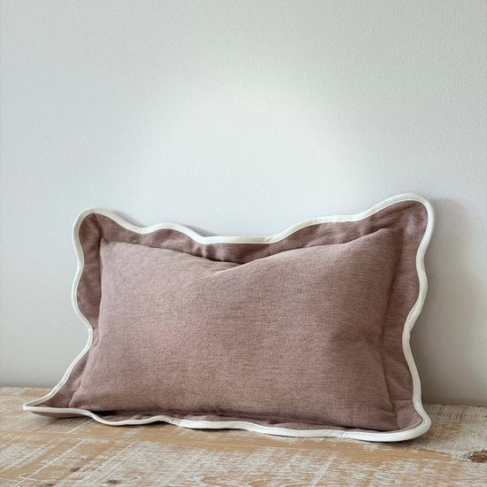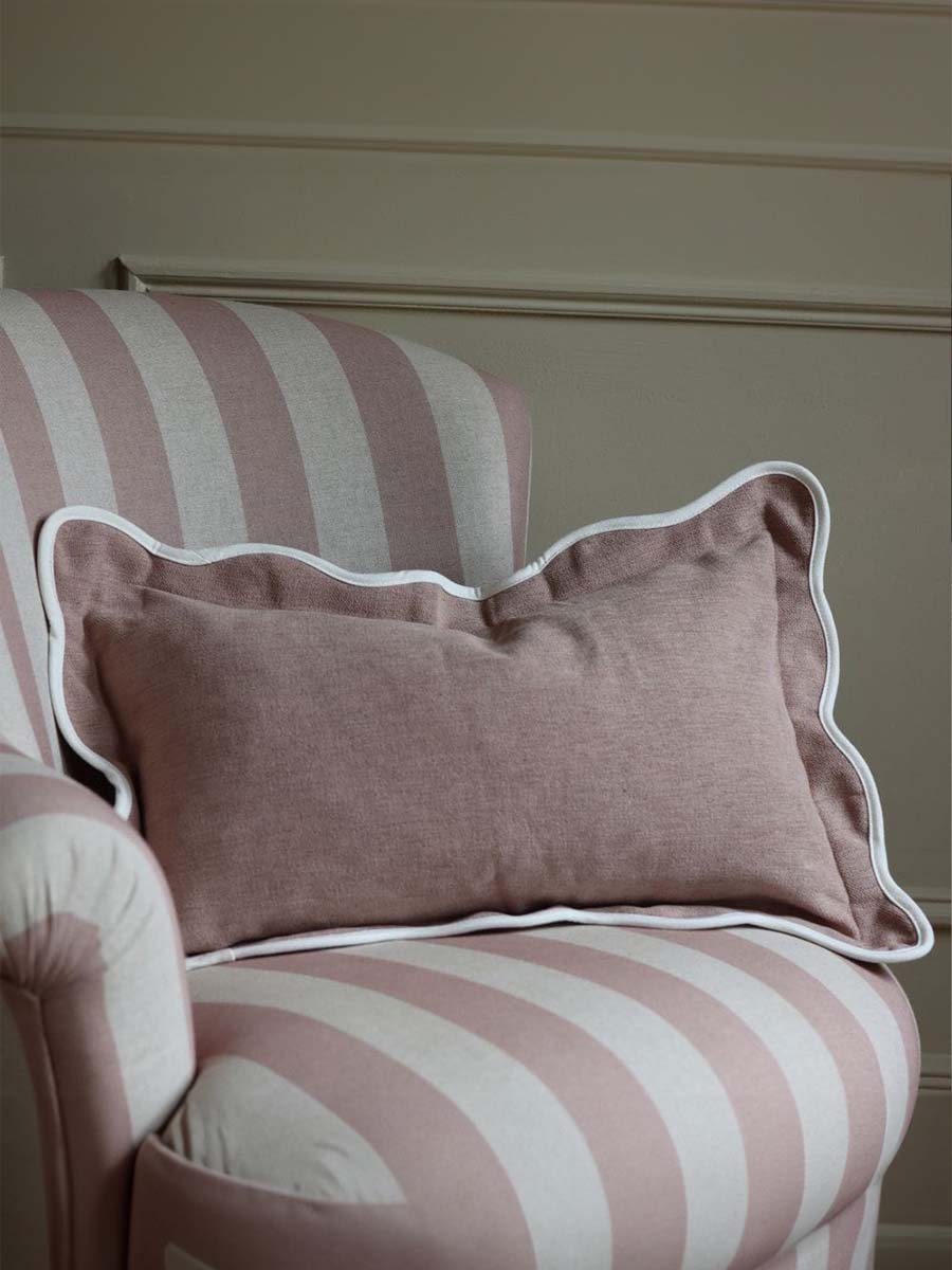 Kissen Louise in einem zurückhaltenden Altrosa, das dem Raum eine warme, weiche Note verleiht. Die fein geschwungene Kantenführung sorgt für subtile Eleganz und macht das Kissen zu einem ruhigen, dekorativen Element.
