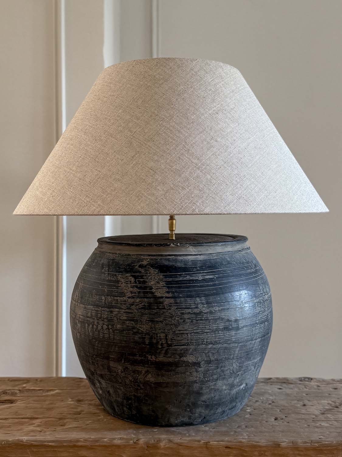 Einzigartige handgefertigte Tischlampe: Der Lampenfuß wurde aus einem etwa 120 Jahre alten Tongefäß hergestellt und hat aufgrund seines Alters eine schöne Patina. Der Lampenschirm ist aus belgischen Leinen gefertigt.