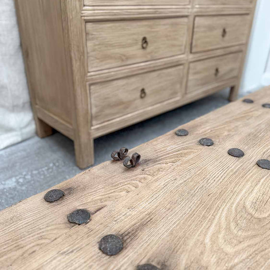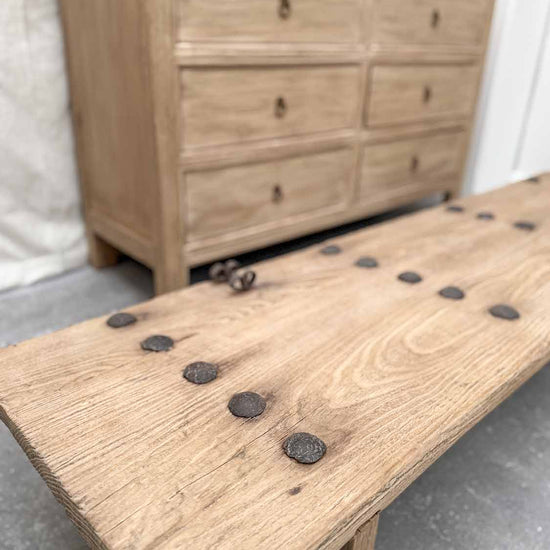 Dieser rustikale Couchtisch aus altem Ulmenholz bringt einzigartigen Charakter und zeitlose Eleganz in Ihren Wohnraum. Gefertigt aus mehr als 100 Jahre altem Ulmenholz, zeichnet sich dieser Tisch durch natürliche Unvollkommenheiten wie Dellen, sichtbare Äste und Maserungen aus, die ihm einen besonderen Charme verleihen. Jeder Tisch ist ein Unikat, das von Kunsthandwerkern mit viel Liebe zum Detail gefertigt wird und garantiert, dass kein Stück dem anderen gleicht. Die rechteckige Form und das vielseitige Design machen ihn zu einer luxuriösen Ergänzung, die sowohl in moderne als auch in rustikale Einrichtungsstile passt.