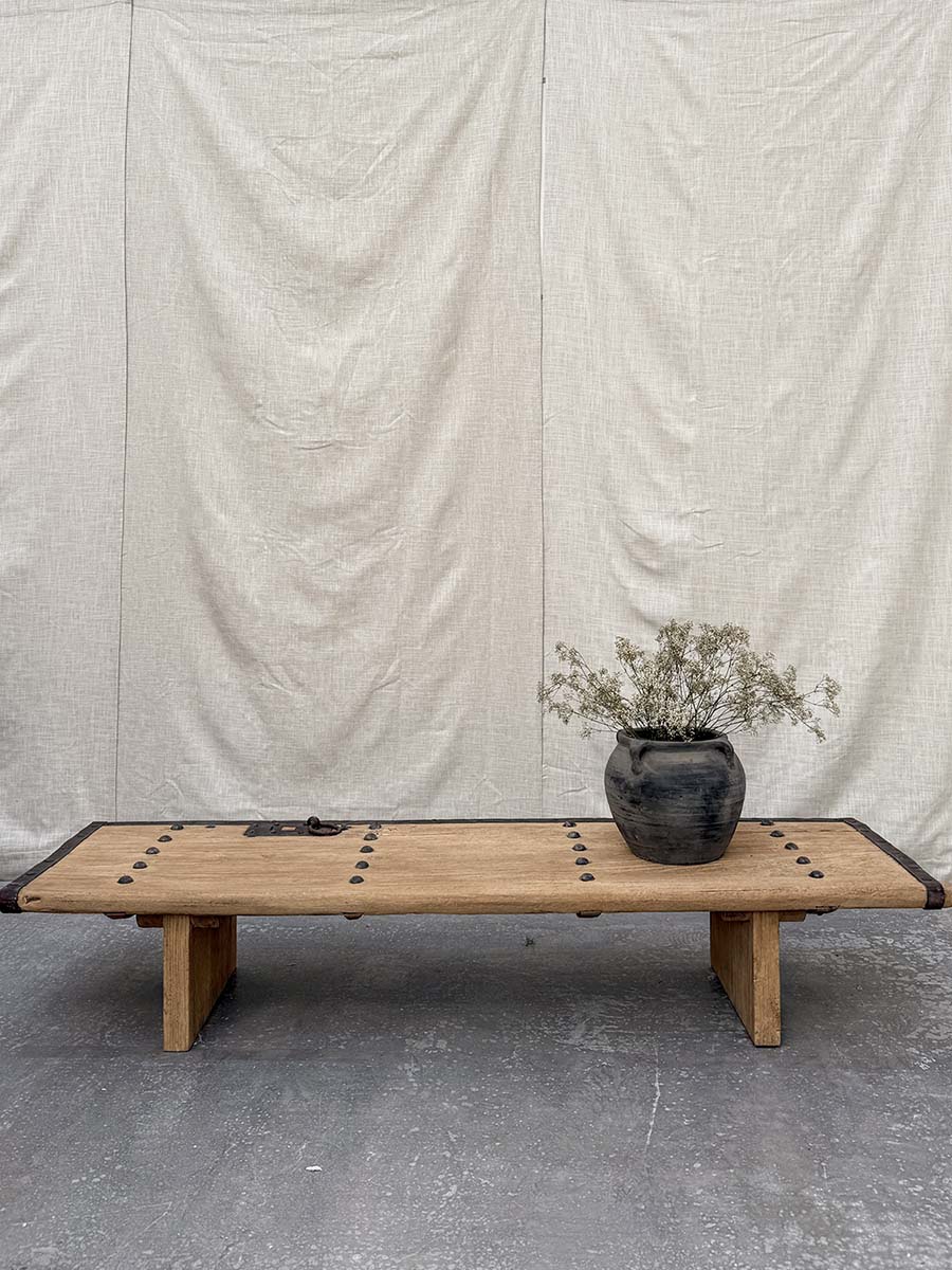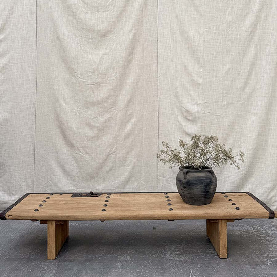 Dieser rustikale Couchtisch aus altem Ulmenholz bringt einzigartigen Charakter und zeitlose Eleganz in Ihren Wohnraum. Gefertigt aus mehr als 100 Jahre altem Ulmenholz, zeichnet sich dieser Tisch durch natürliche Unvollkommenheiten wie Dellen, sichtbare Äste und Maserungen aus, die ihm einen besonderen Charme verleihen. Jeder Tisch ist ein Unikat, das von Kunsthandwerkern mit viel Liebe zum Detail gefertigt wird und garantiert, dass kein Stück dem anderen gleicht. Die rechteckige Form und das vielseitige Design machen ihn zu einer luxuriösen Ergänzung, die sowohl in moderne als auch in rustikale Einrichtungsstile passt.