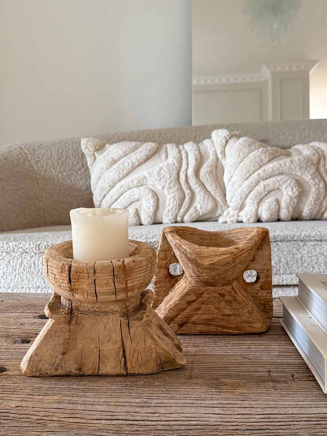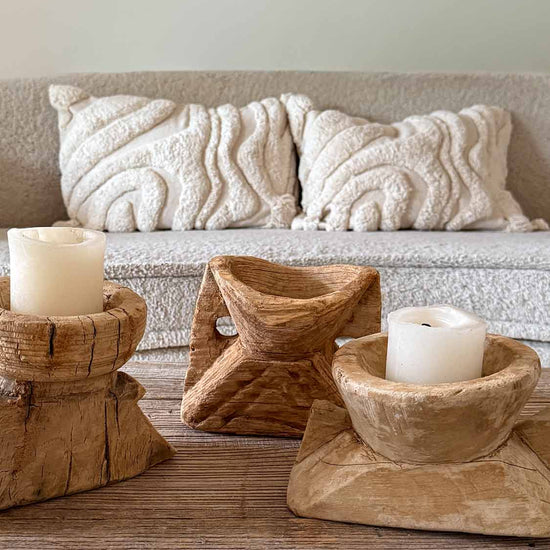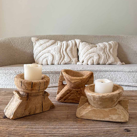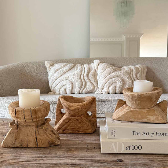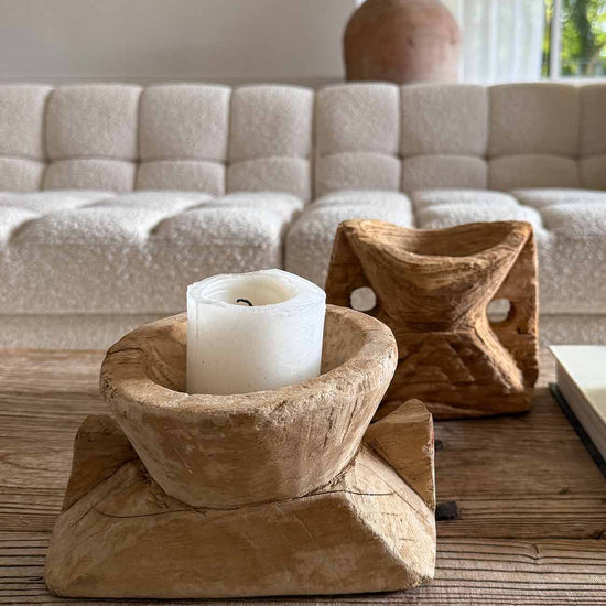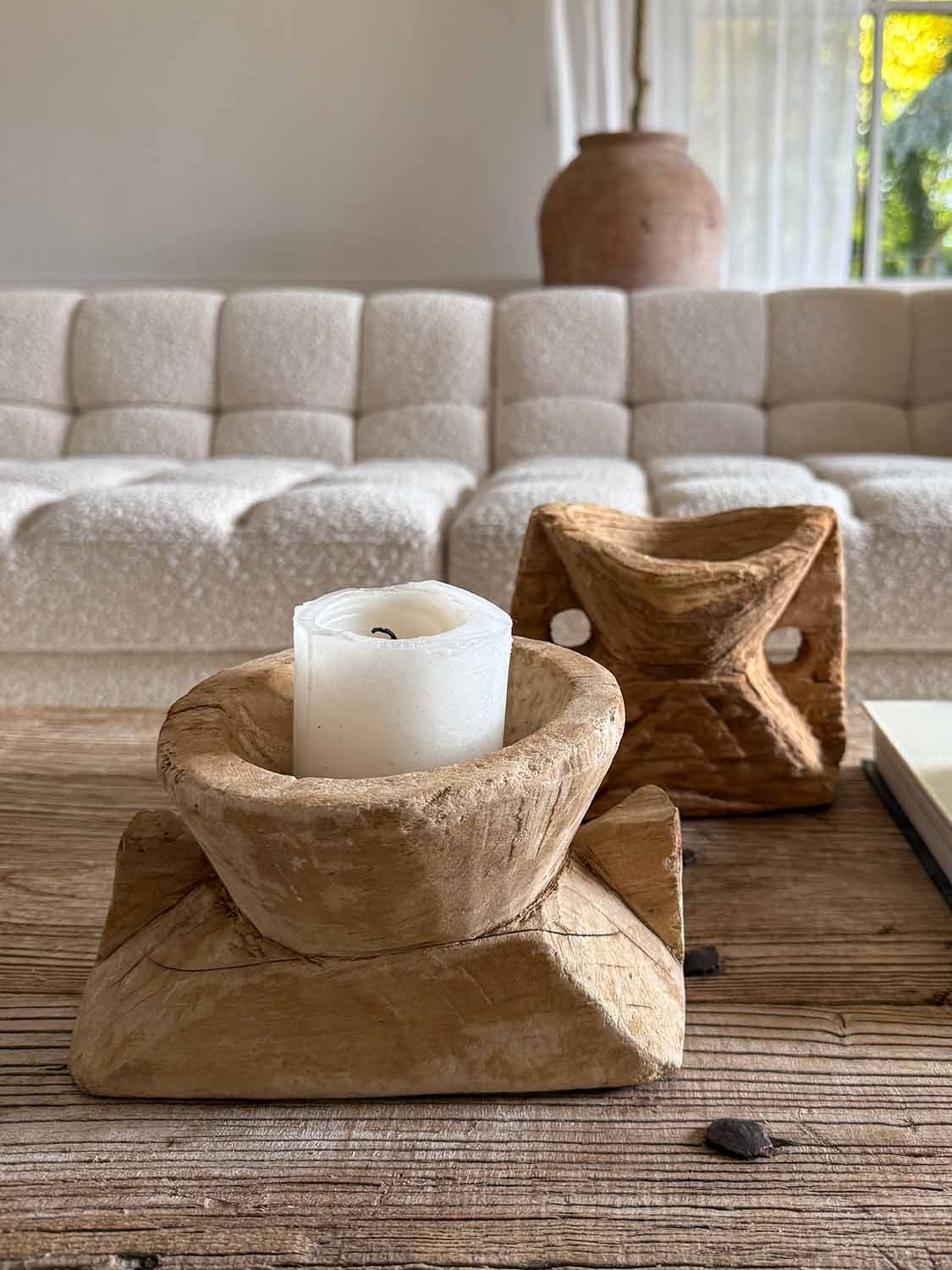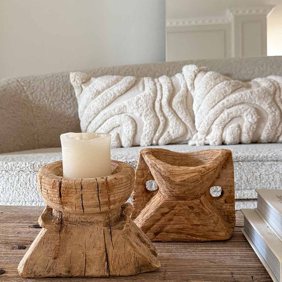 Ursprünglich in ländlichen Regionen Indiens als traditionelles Saatwerkzeug verwendet, hat dieses handgefertigte Holzobjekt heute eine neue Bestimmung als skulpturaler Kerzenhalter gefunden. Jedes Stück erzählt seine eigene Geschichte mit Spuren des Gebrauchs, individuellen Farbnuancen und einer Patina, die nur durch Zeit und Arbeit entstehen kann.