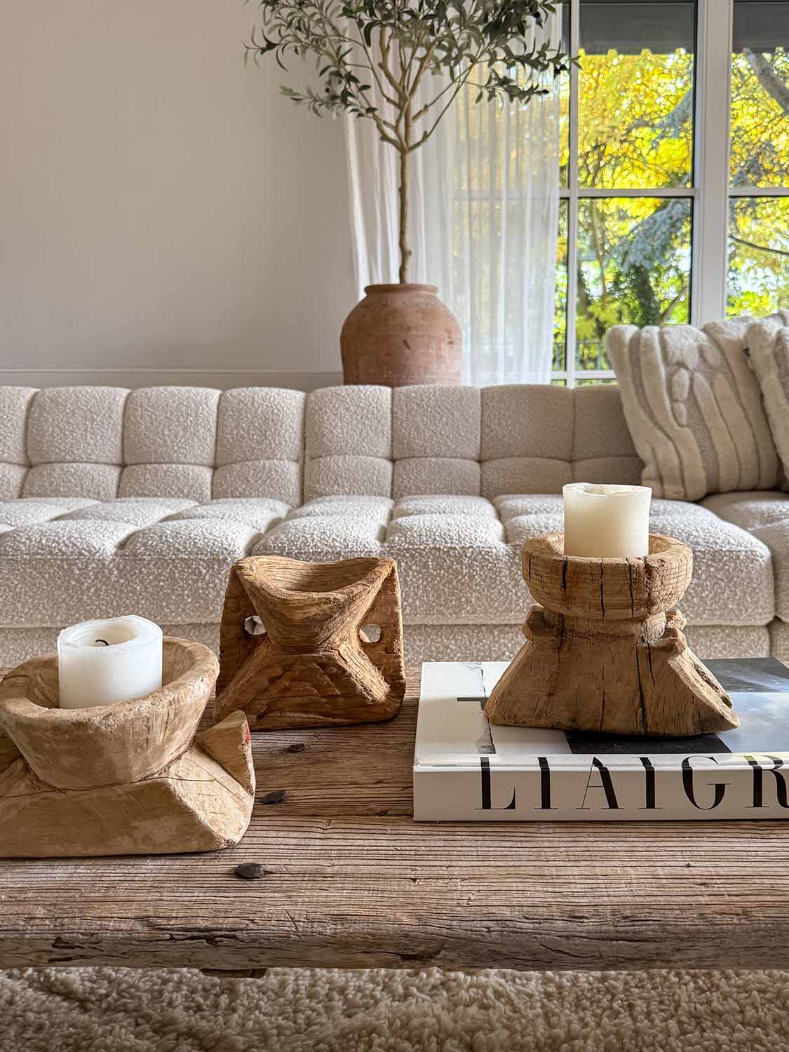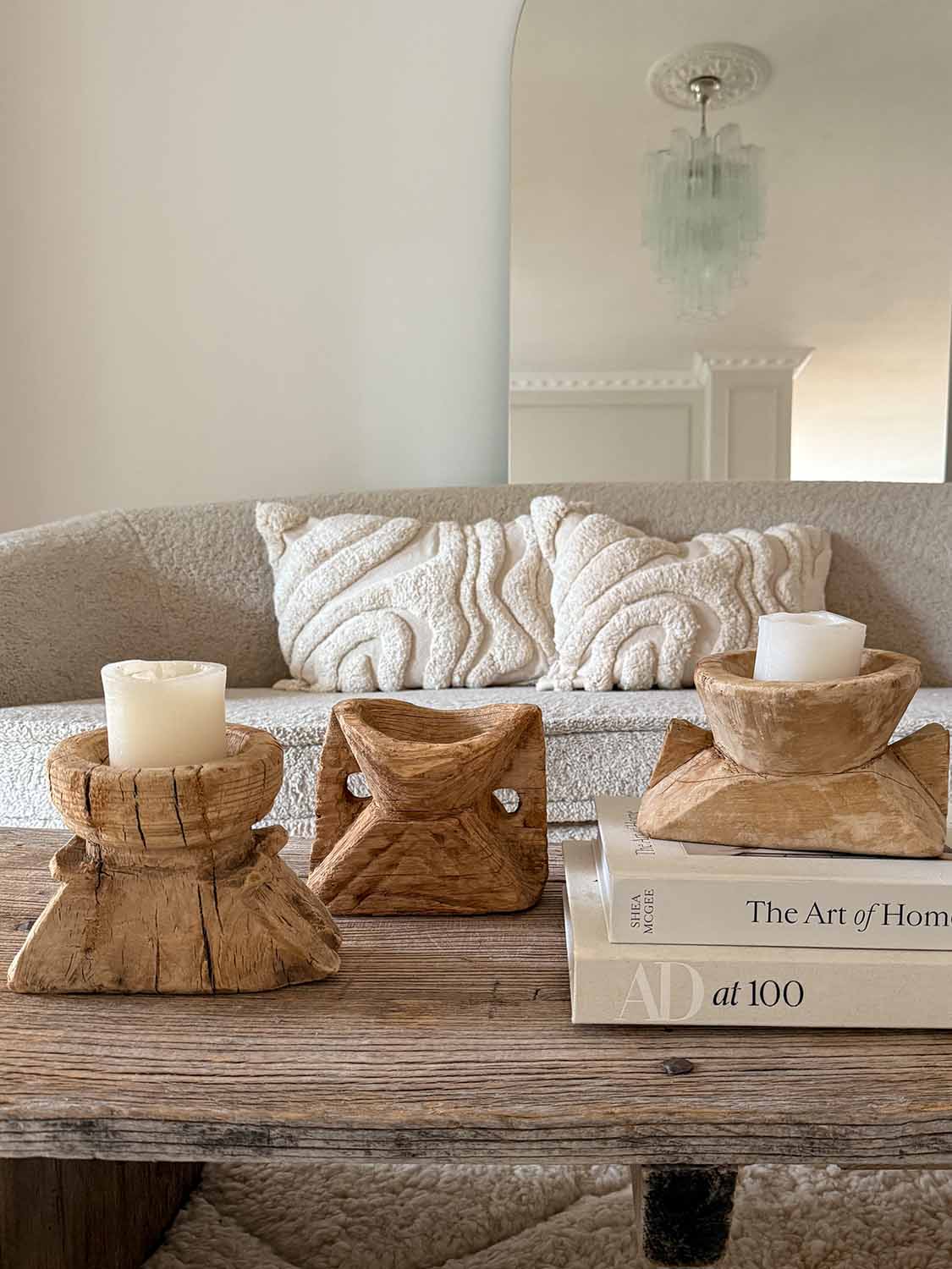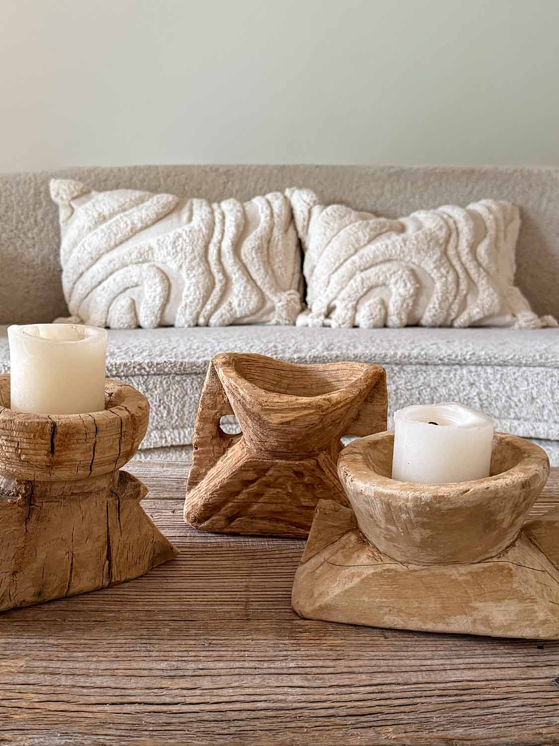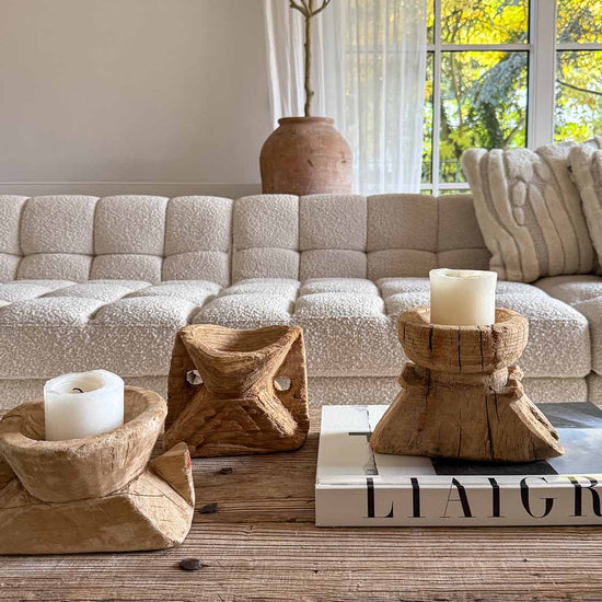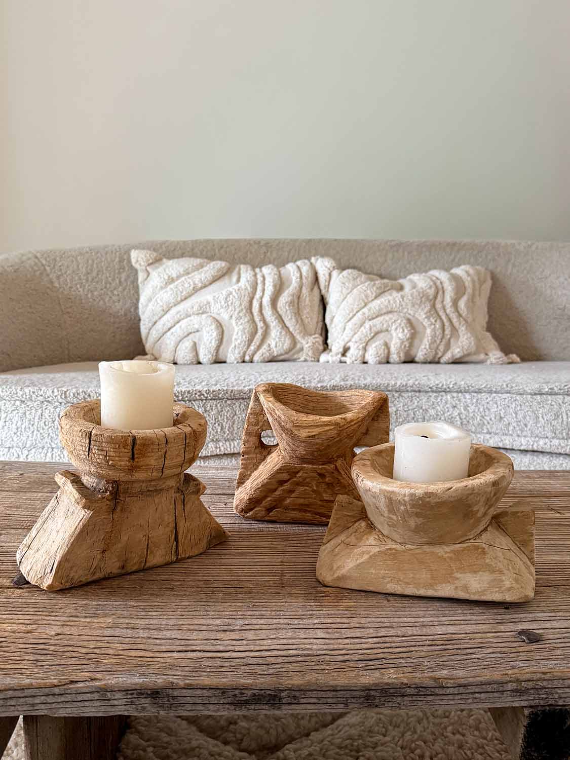 Ursprünglich in ländlichen Regionen Indiens als traditionelles Saatwerkzeug verwendet, hat dieses handgefertigte Holzobjekt heute eine neue Bestimmung als skulpturaler Kerzenhalter gefunden. Jedes Stück erzählt seine eigene Geschichte mit Spuren des Gebrauchs, individuellen Farbnuancen und einer Patina, die nur durch Zeit und Arbeit entstehen kann.